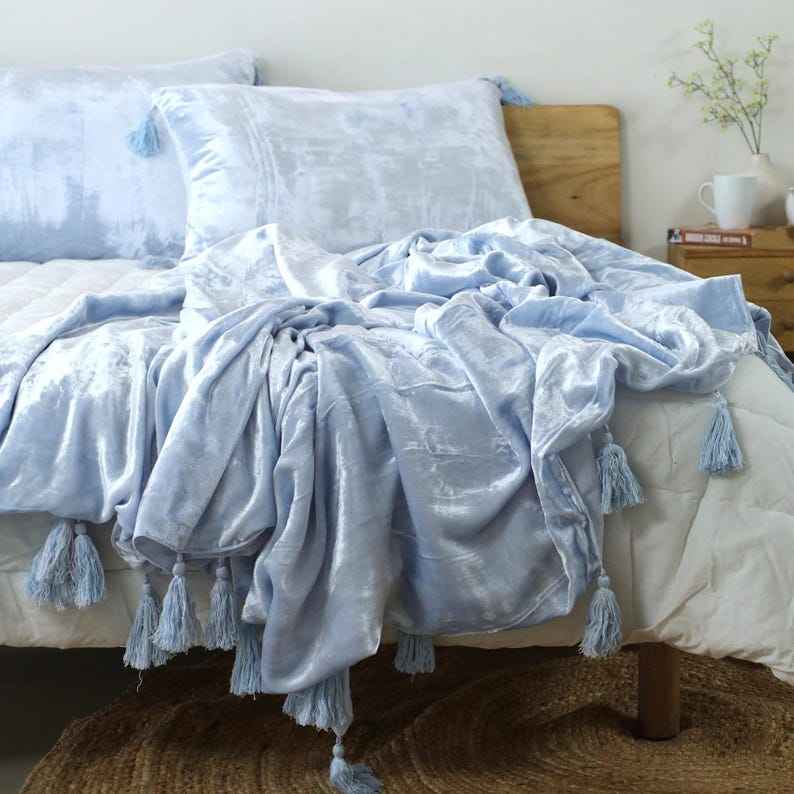 Vente en gros de couvre-lit en velours bleu pastel, couverture nouée à glands, fait à la main, couvre-lit doux Boho pour l'hiver, couvertures de lit pour la maison