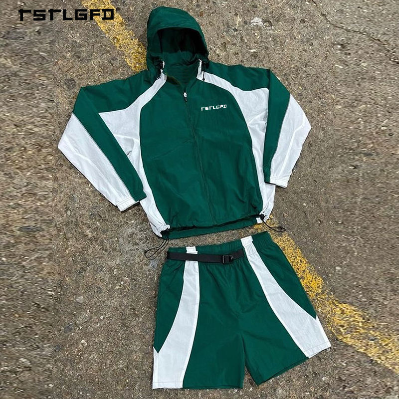 Ensemble court homme grande taille en nylon color-block avec coupe-vent rose et blanc et short – Survêtement streetwear deux pièces en gros