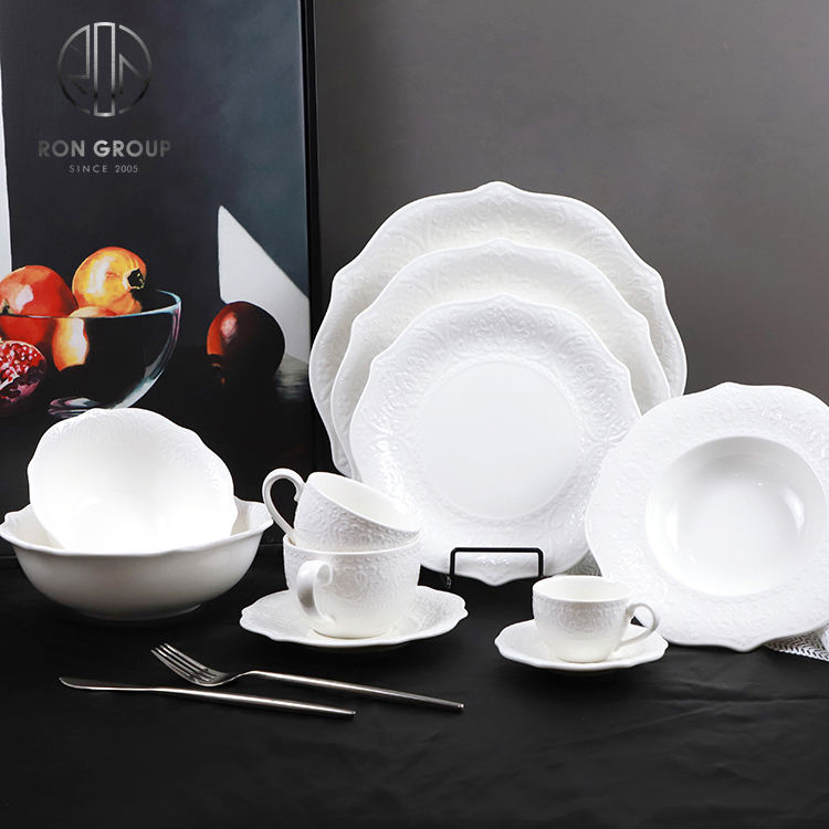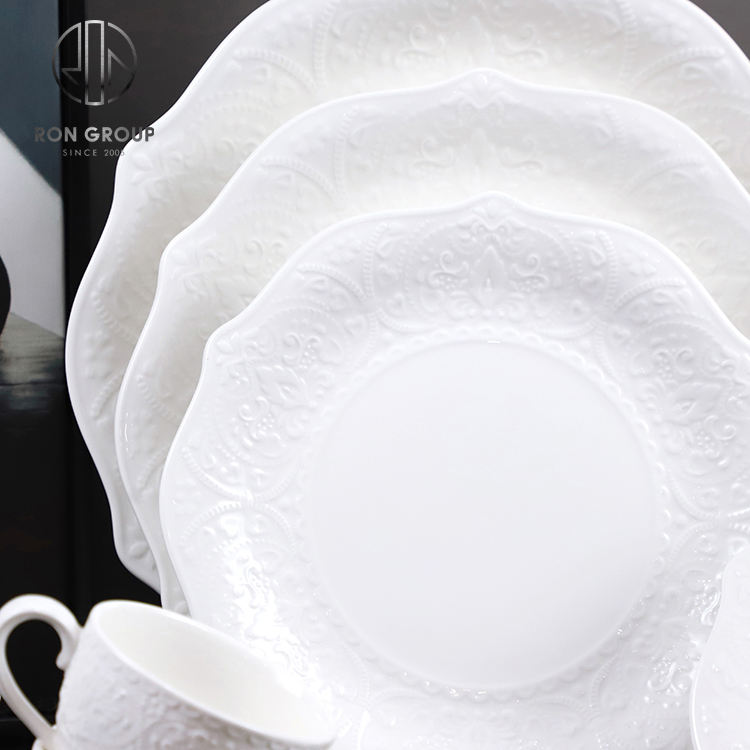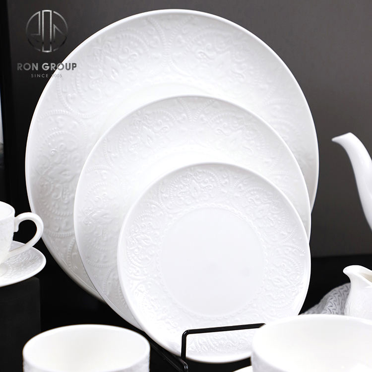 Ensemble de vaisselle en céramique ronde blanche de qualité supérieure en gros, motif en relief, pour hôtel et restaurant