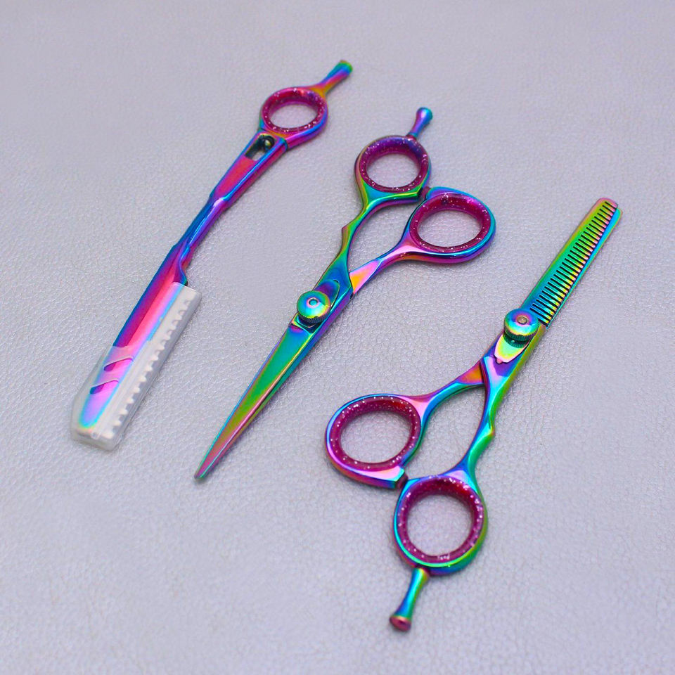 Salon de coiffure professionnel arc-en-ciel avec marque personnalisée, ciseaux amincissants et rasoir au Pakistan, vente en gros