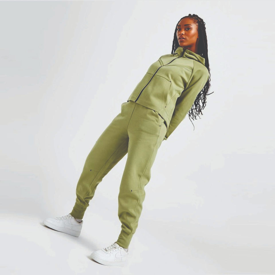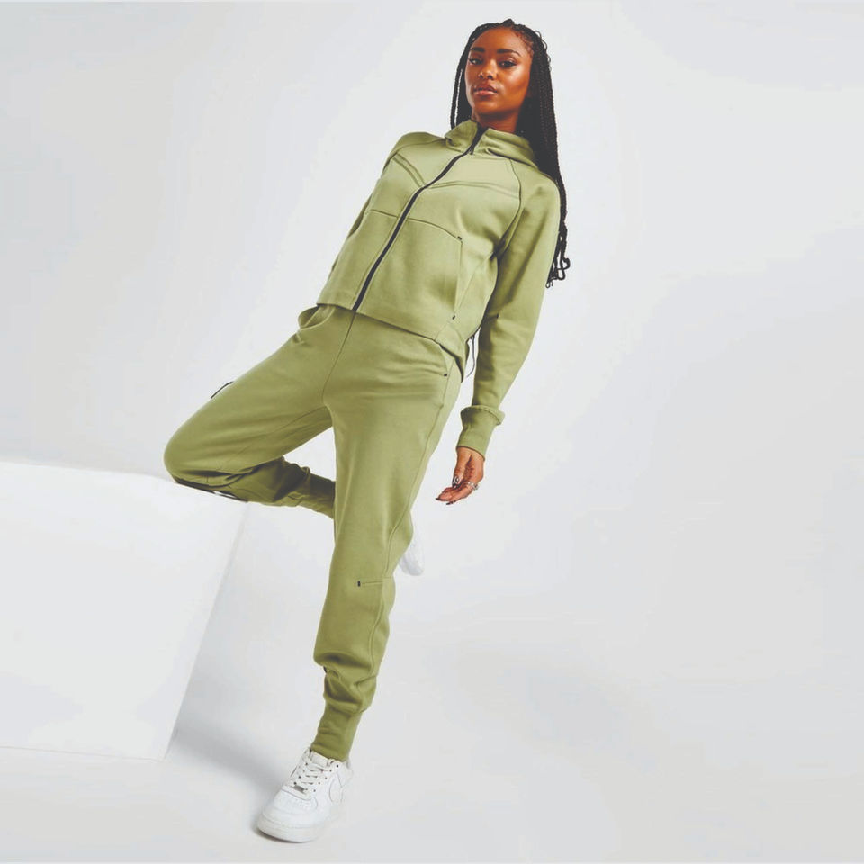 Vente en gros Marque privée 69% coton 31% polyester Survêtement polaire technique pour femmes Vert Sweat à capuche zippé Joggers Pantalon de survêtement Survêtement