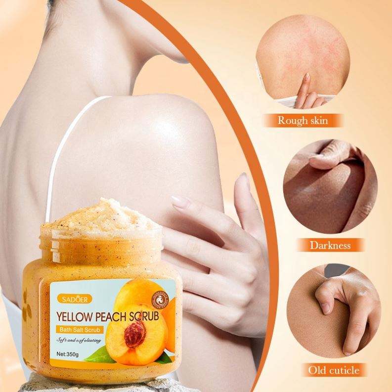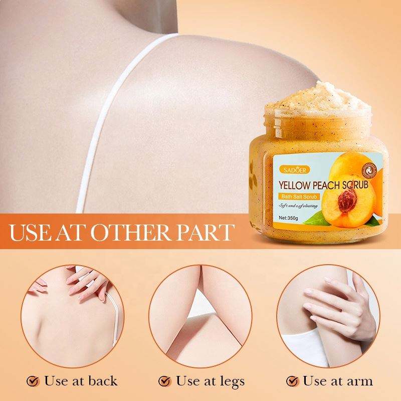 Vente en gros Marque privée Améliorez la rugosité Gommage corporel hydratant Jaune Pêche Exfoliant Blanchiment de la peau du poulet Gommage corporel