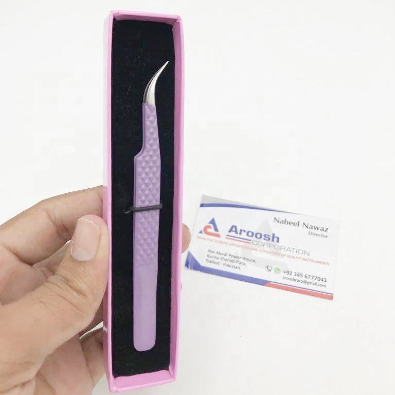 Pince à épiler professionnelle en acier inoxydable durable, revêtement poudré violet, forme en J, avec poignée diamantée solide pour extensions de cils