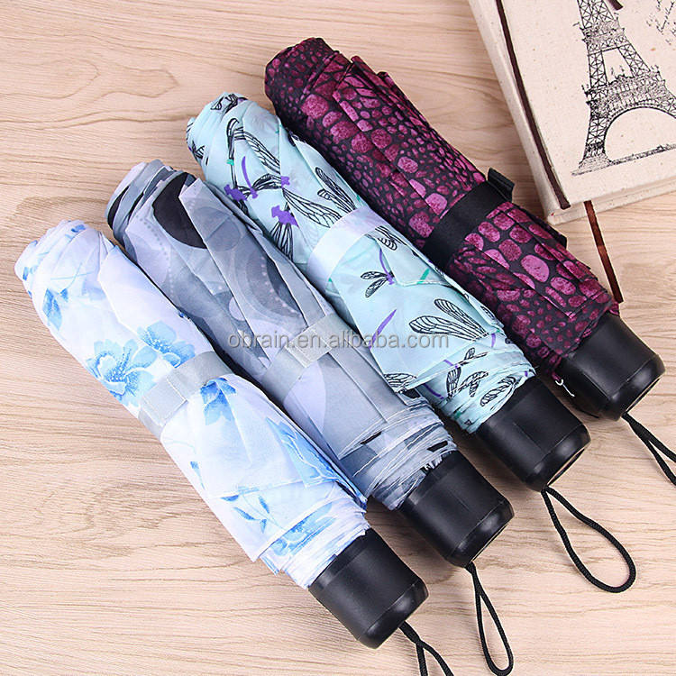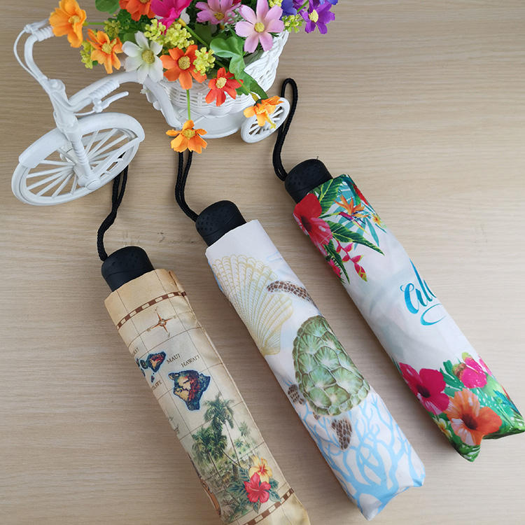 Chaque pièce en gros promotionnel pas cher 21 pouces imprimé Logo de conception de fleur personnalisé 3 parapluie de voyage Compact pliant emballé dans un poly-bag transparent, puis 10pcs par boîte intérieure, 40pcs par carton.