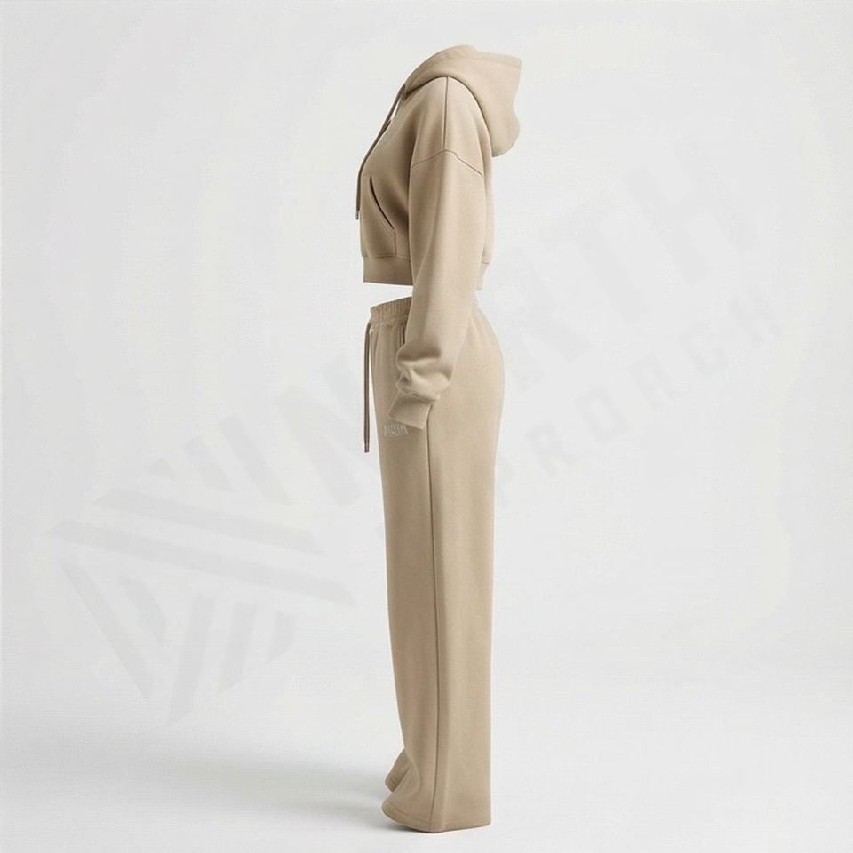 Ensemble de survêtement deux pièces de qualité supérieure avec logo personnalisé, pantalon de survêtement à jambes larges, haut court à capuche, tenue de sport pour femmes, tenue de gym