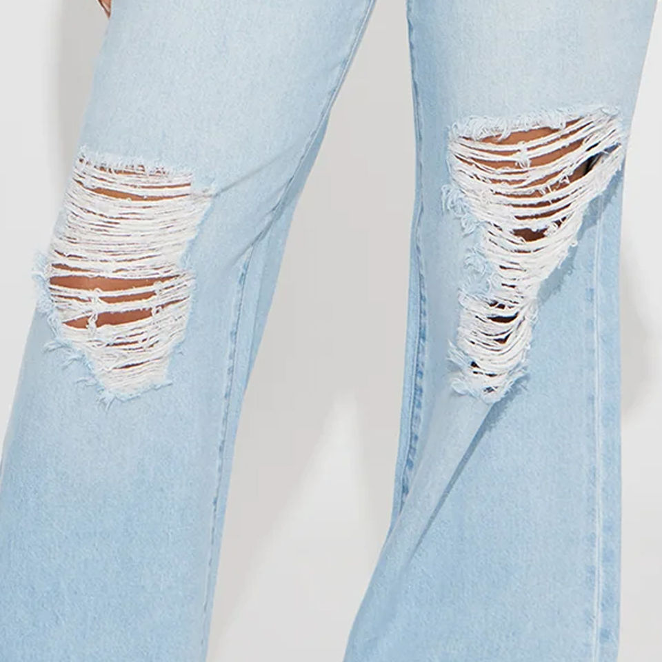 Vente en gros, tenue décontracté de rue, pantalon et pantalon en denim déchiré pour femmes, jean personnalisé délavé léger à taille moyenne pour femmes