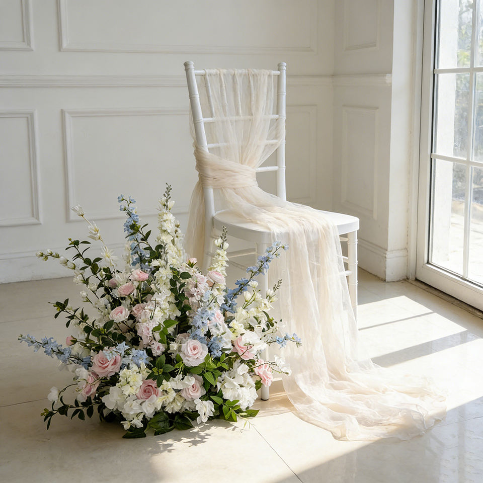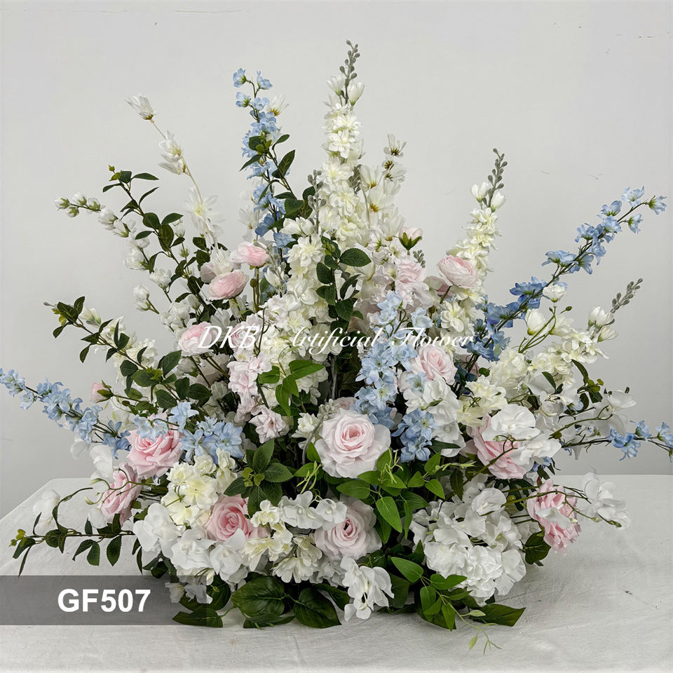 Vente en gros de rangées de fleurs artificielles en soie à toucher réel pour allées de mariage, fête des Mères, remise de diplôme, événements et fêtes, en bleu et rose