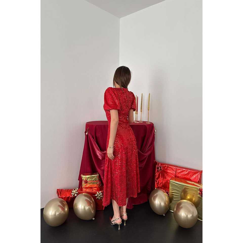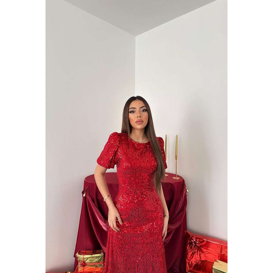 Wholesale Red Sequin Floor-Length Evening Dress XS to XL Party Gown with Tiered Draped Rhinestone Pearl Decor for Homecoming