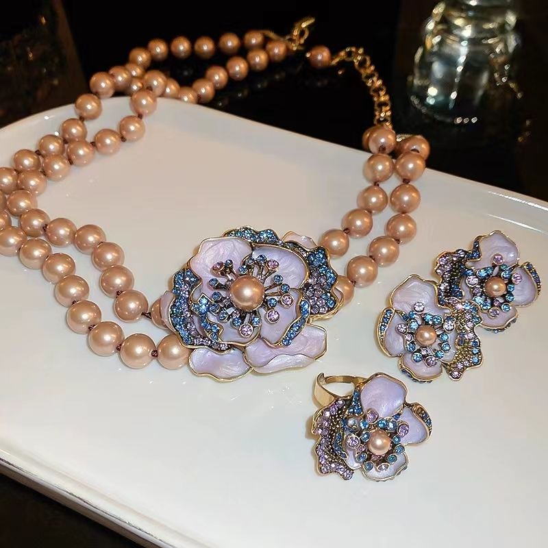 Wholesale Retro Court Style Women Luxury Jewelry Sets Exaggerated Purple Pearl Flower Earring Rings Vintage Necklace