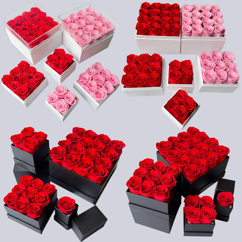 Vente en gros de roses éternelles en boîte carrée, roses préservées pour toujours, cadeau pour la Saint-Valentin