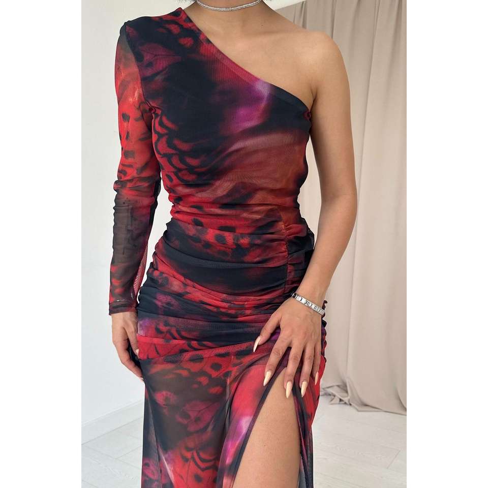 Wholesale Satin One-Shoulder Ball Gown Dress Chic Formal XL XS Sizes Slit A-Line Tulle Three-Quarter Red Evening Floor-Length