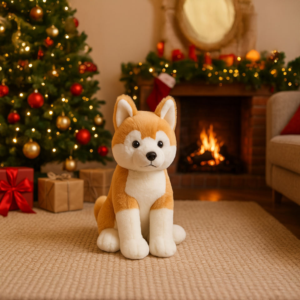 Vente en gros de peluches simulées de chiens Akita japonais, adorables jouets en peluche assis avec une queue moelleuse, logo personnalisé