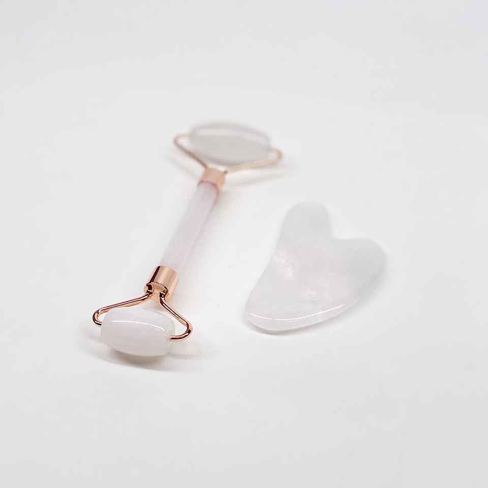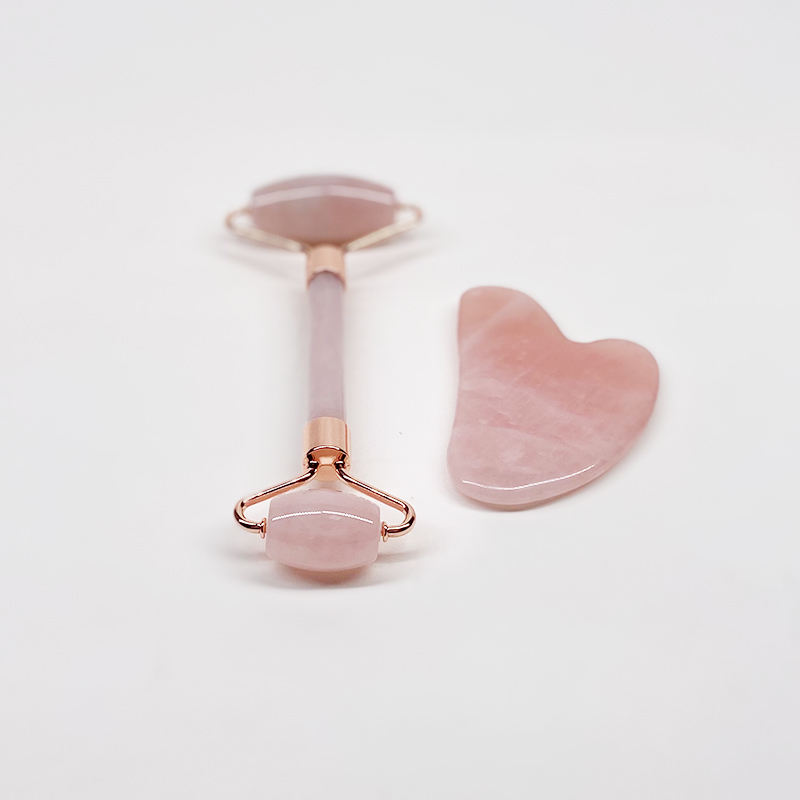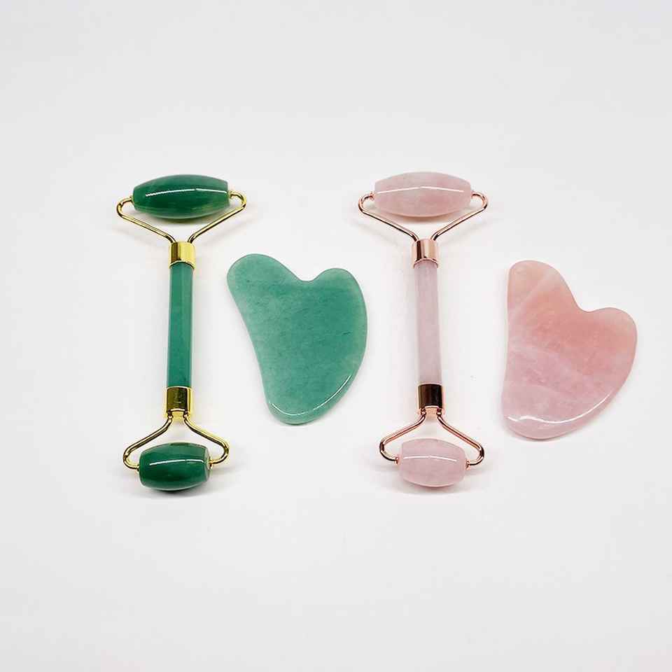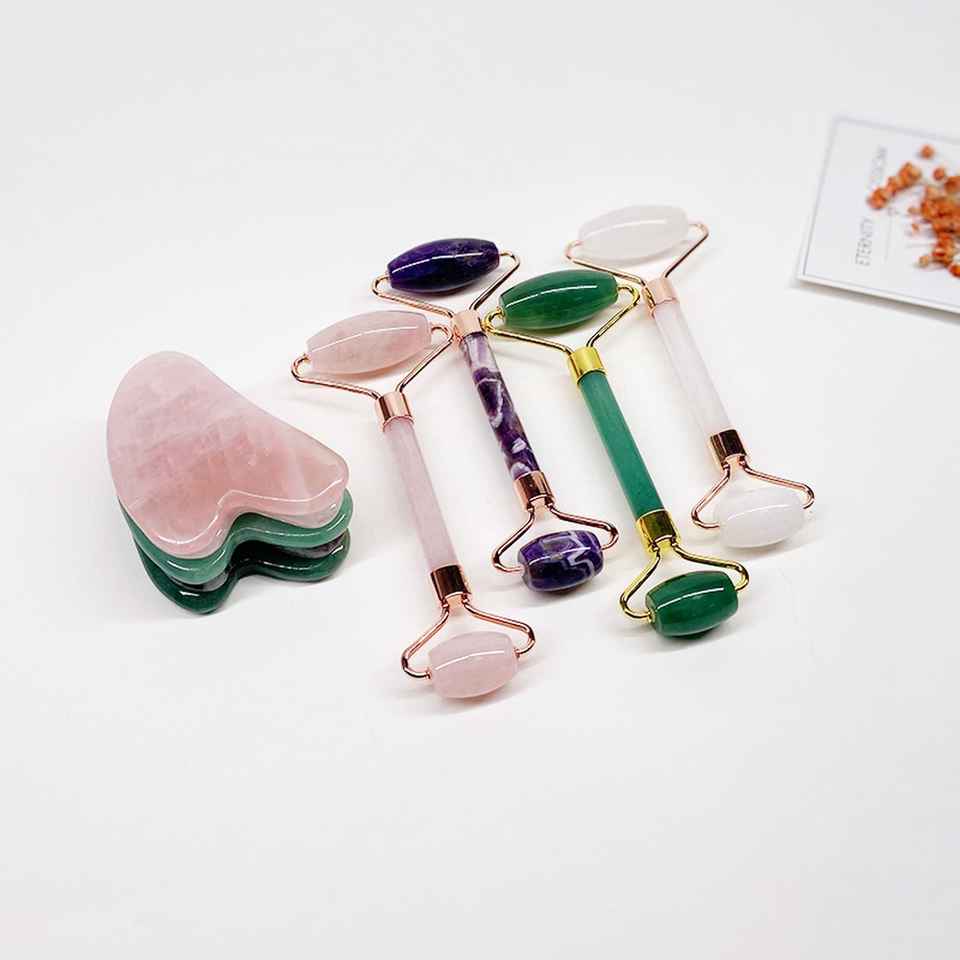 Outils de soin de la peau en gros, rouleau de massage facial en cristal naturel personnalisé, rouleau de massage facial en quartz rose, ensemble Gua Sha