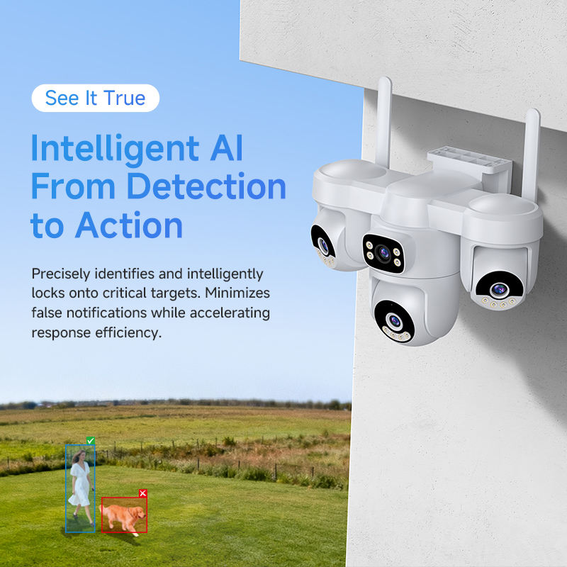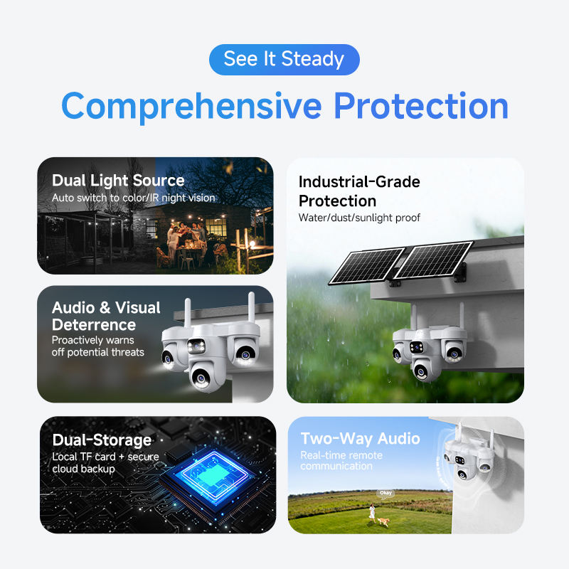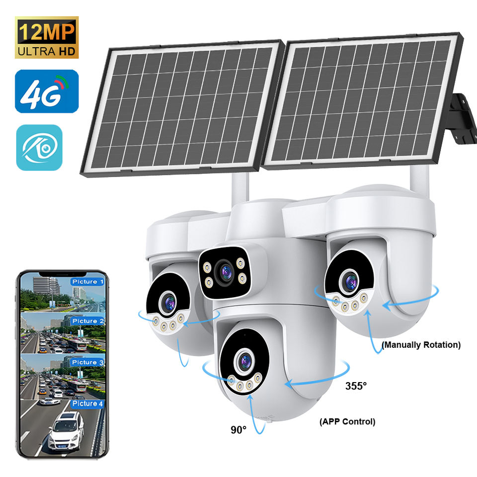 Caméra de sécurité solaire 4G en gros, 3 PTZ, 4 écrans, enregistrement 24h/24 et 7j/7, 2 panneaux solaires, batterie 12000mAh, 12MP, IP66, audio bidirectionnel