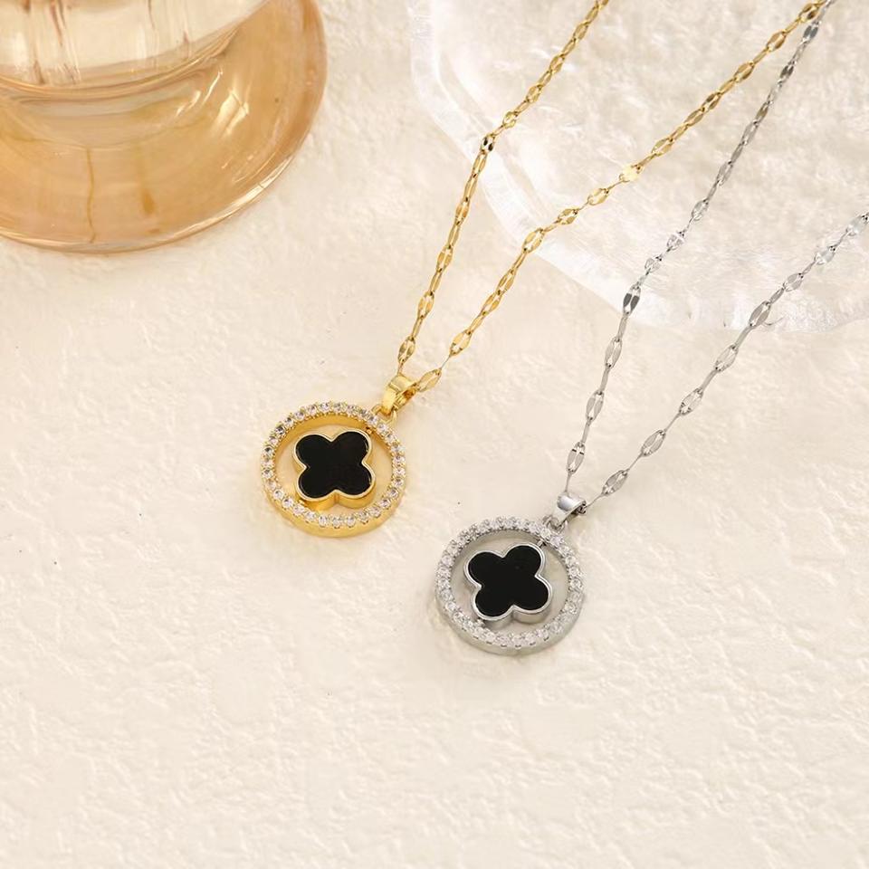 Vente en gros Chaîne en acier inoxydable Collier avec pendentif trèfle en zircon incrusté de zircons plaqué or 18 ct