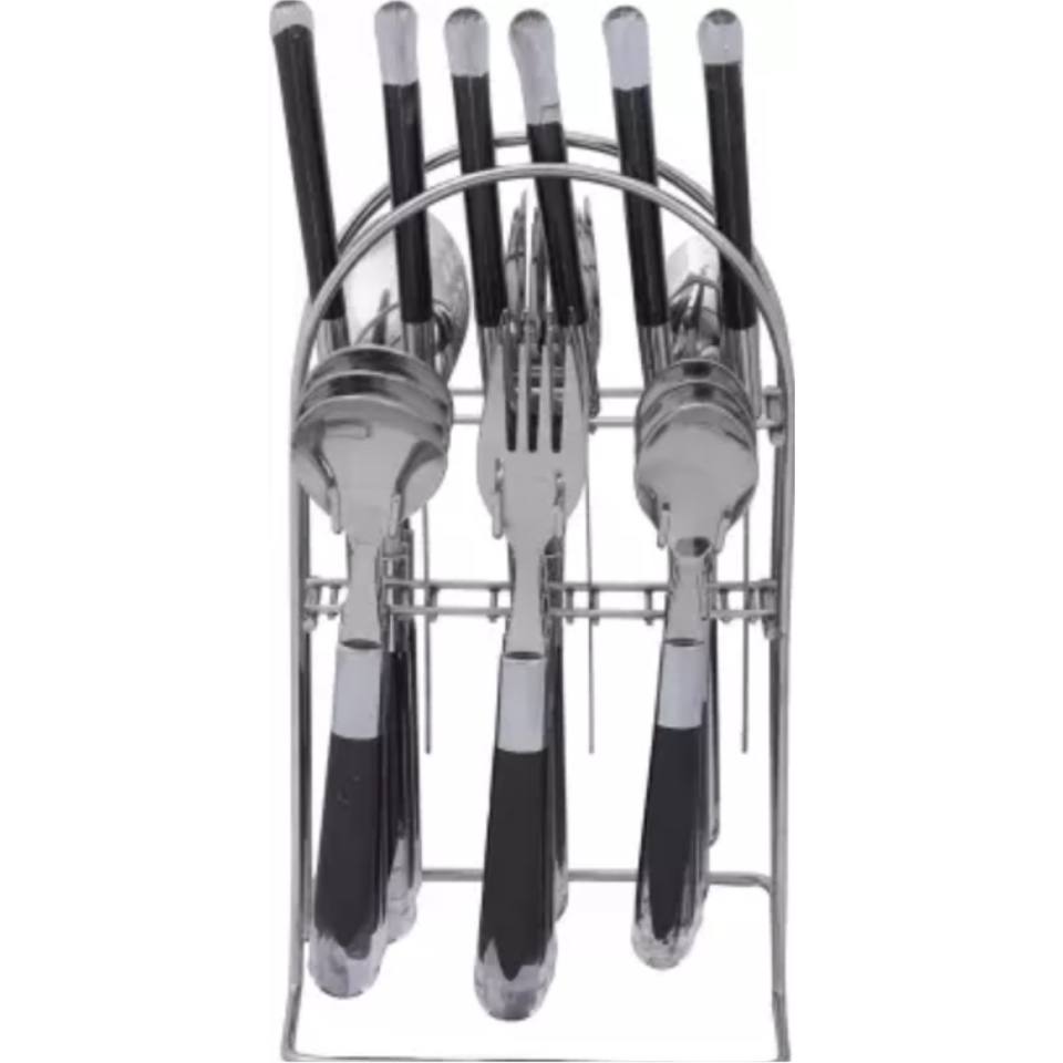Ensemble de couverts en acier inoxydable en gros avec support métallique, 24 pièces, taille familiale, ensemble de couverts, passe au lave-vaisselle, noir et argent