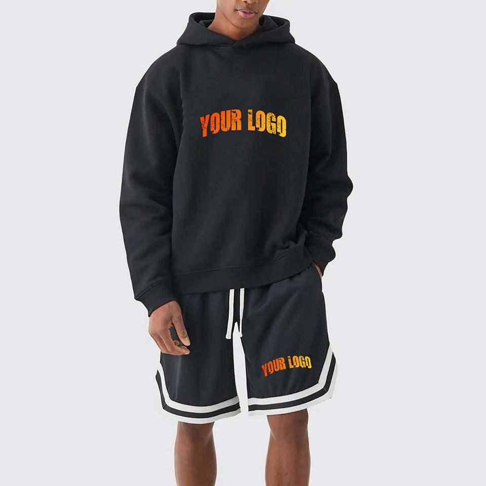 Wholesale Summer Men's Casual 2-Piece Outfit Solid Colour 100% Cotton Knee-Length Oversized Heavyweight Hoodie Shorts Tracksuit