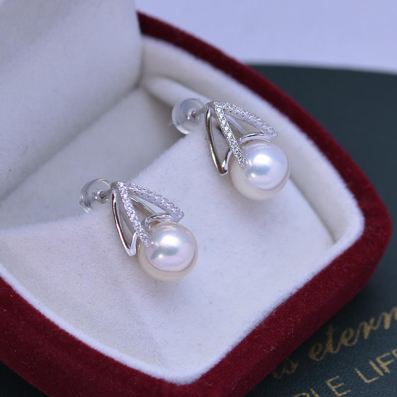 Wholesale Supply of S925 Silver Crescent Full Set Earrings Freshwater 8-9mm White Pearls with Strong Light Fine Flaws