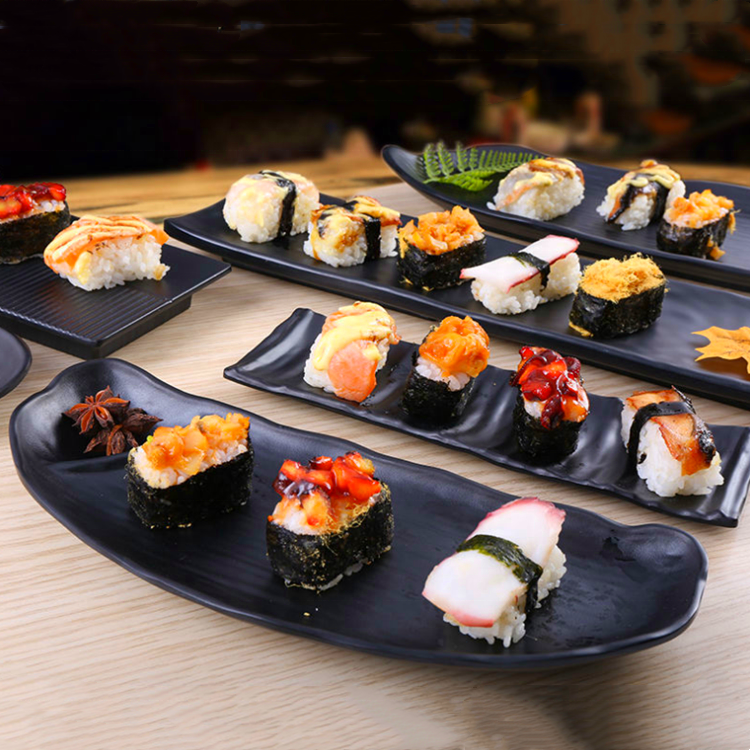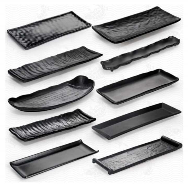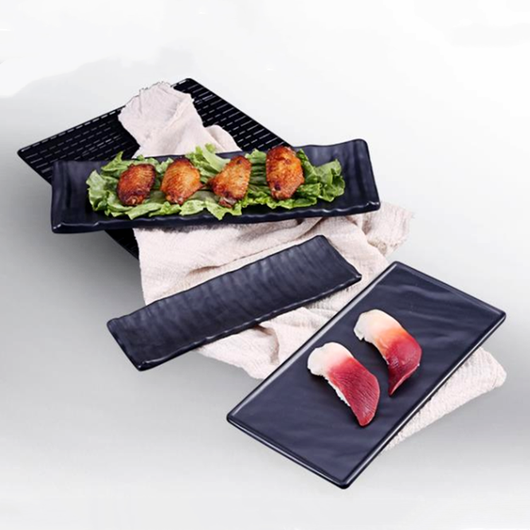 Vaisselle en gros assiettes de chargeur rectangulaires assiette de service à pizza noire assiette de mélanine noire snack sushi
