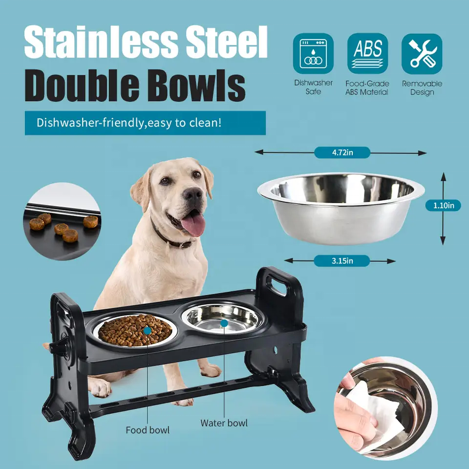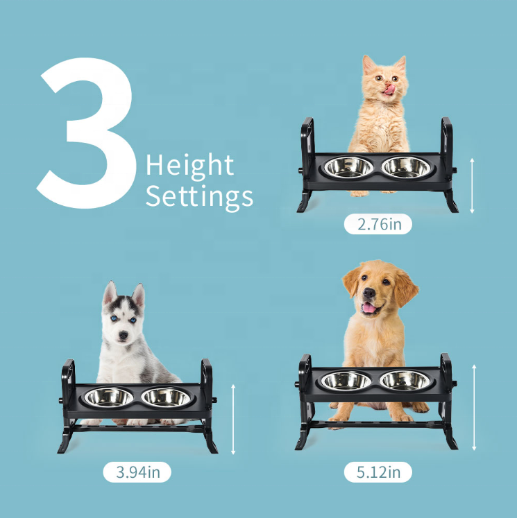 Vente en gros de bols doubles antidérapants surélevés à trois réglages de hauteur pour animaux de compagnie support de bol pour chien surélevé en ABS avec 2 bols en acier inoxydable
