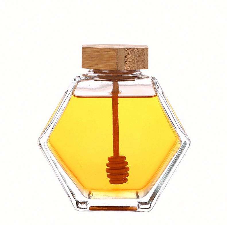 Pot en verre pour emballage alimentaire avec bouchon hexagonal en fer transparent en gros