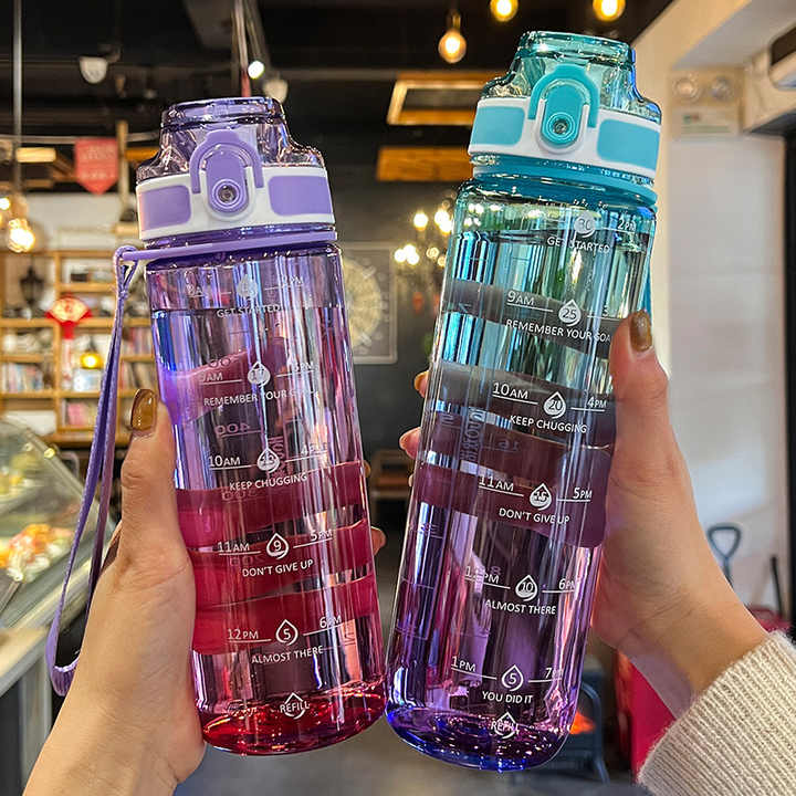 Bouteille d'eau en plastique de sport de couleur dégradée 1L portable transparente en gros avec couvercle escamotable et échelle