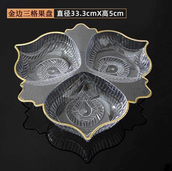 Vente en gros de plateau de bureau de salon en plastique de qualité alimentaire au design unique pour la maison plateau de rangement à 3 compartiments pour collations et fruits avec bord doré