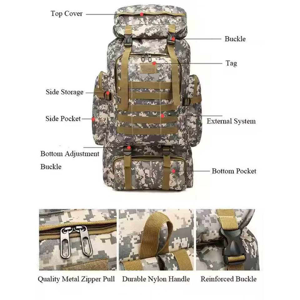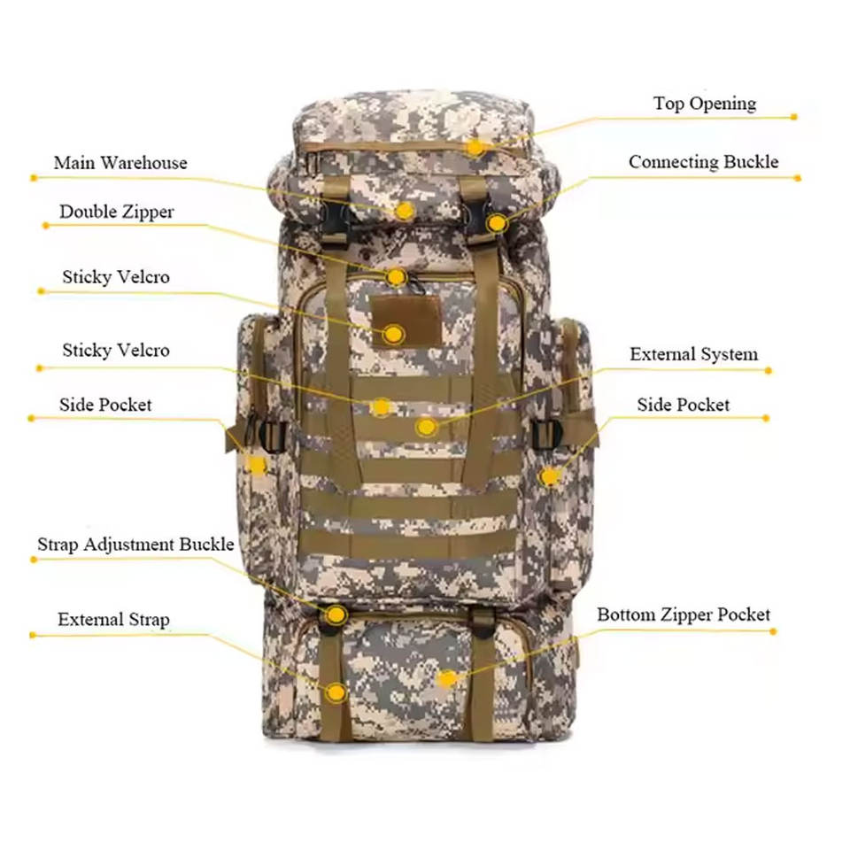 Sac à dos à cadre interne unisexe en gros, capacité extensible de 40L à 80L, imperméable, randonnée d'automne, camping, chasse, camouflage