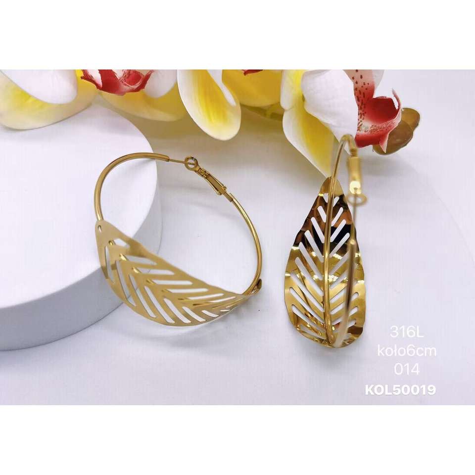 Wholesale VIKILADY 600mm Diameter 316L Stainless Steel 585 Gold Leaf Shape Hoop Earrings Polish Physical Jewelry Fashion Style