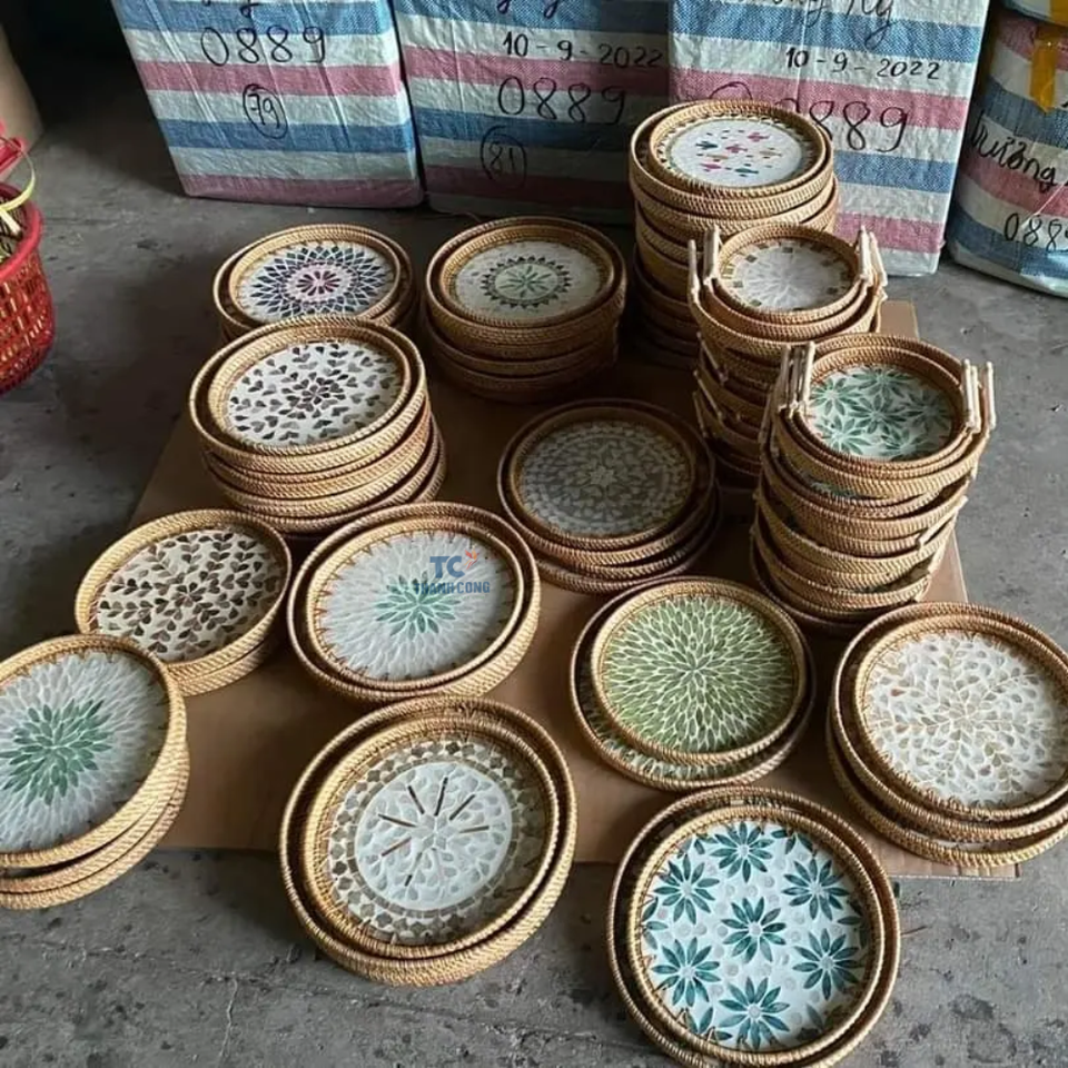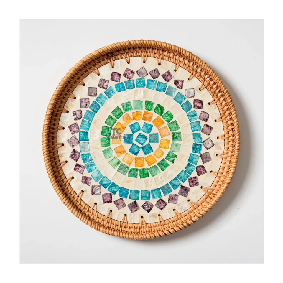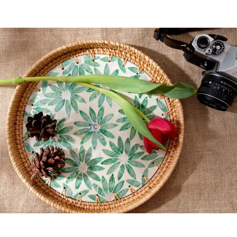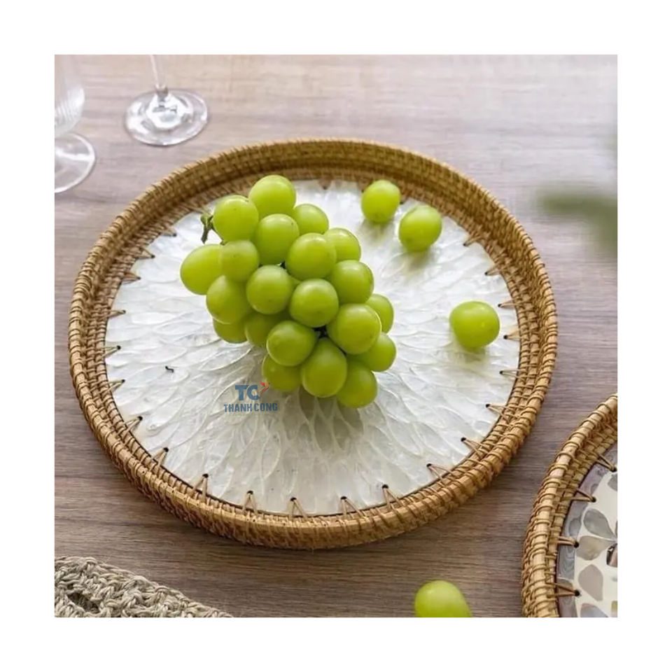 Wholesale Vietnam 2021 Hot Product Natural Unique Decor Round Serving Tray Mother of Pearl Rattan Tray Shell Round Rattan