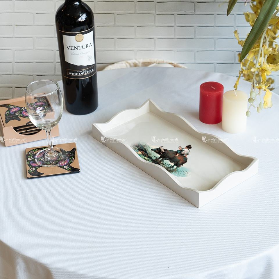 Vente en gros de couleur blanche ou personnalisée, plateau de laque design, plateau de service en bois, design tropical avec motif unique