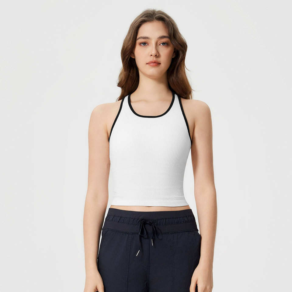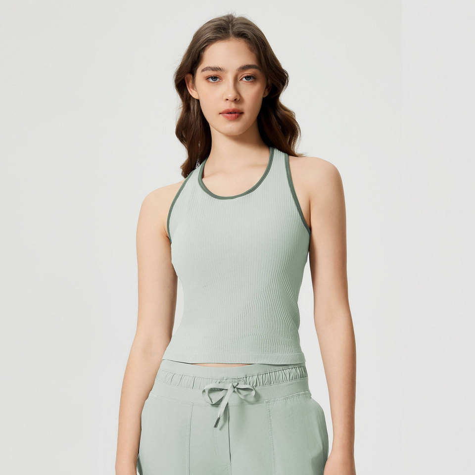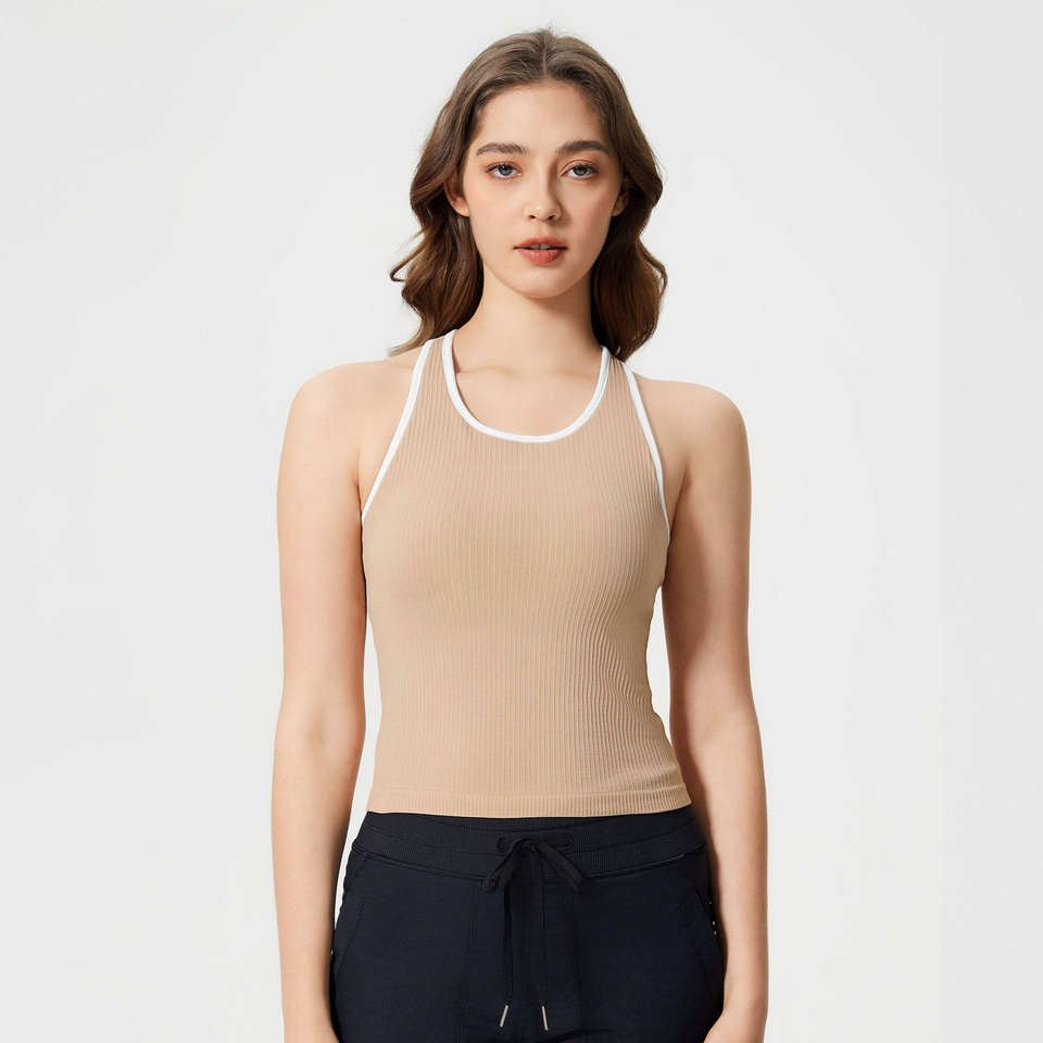 Débardeur de gymnastique rembourré sans manches à contraste de couleur pour femmes vente en gros nouveau printemps coupe ajustée côtelé sans couture hauts de yoga fitness