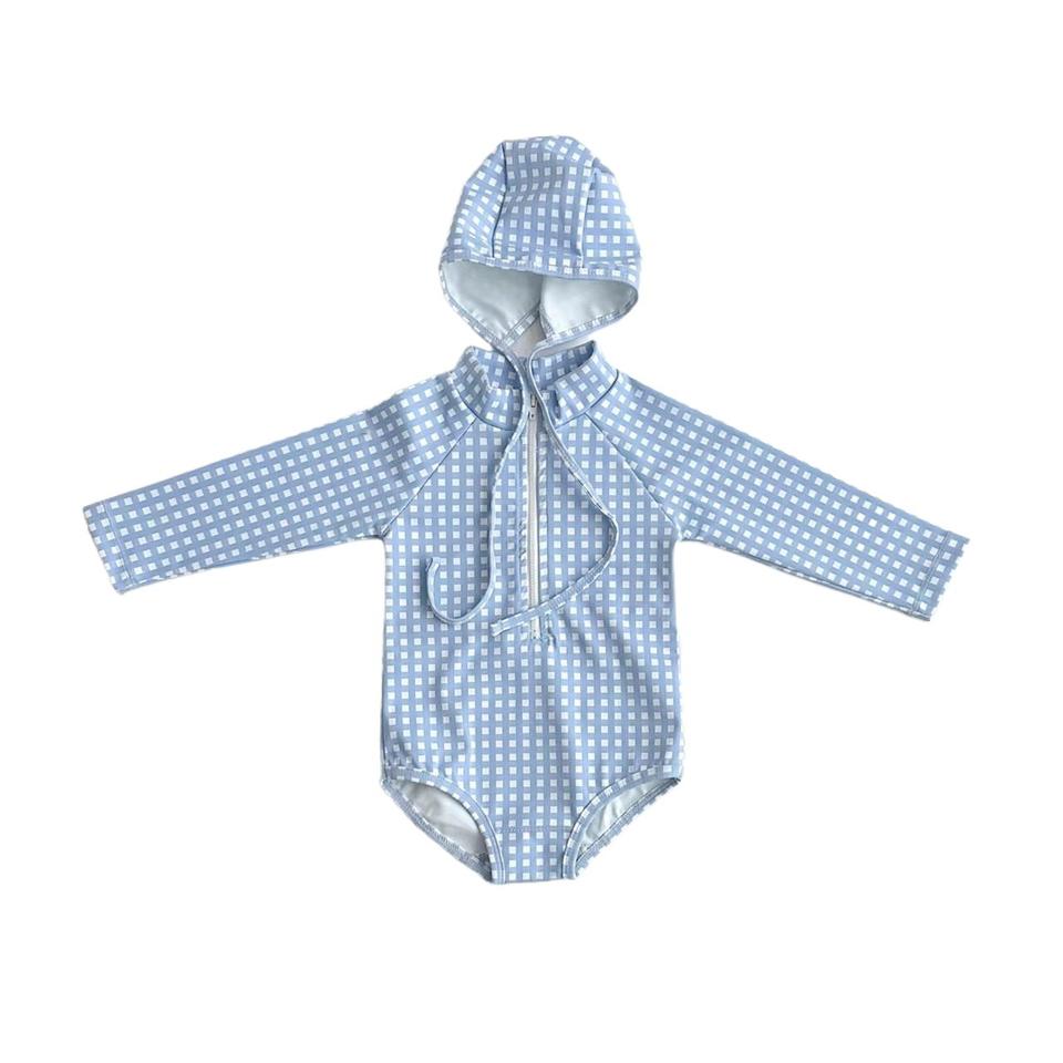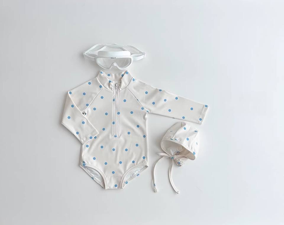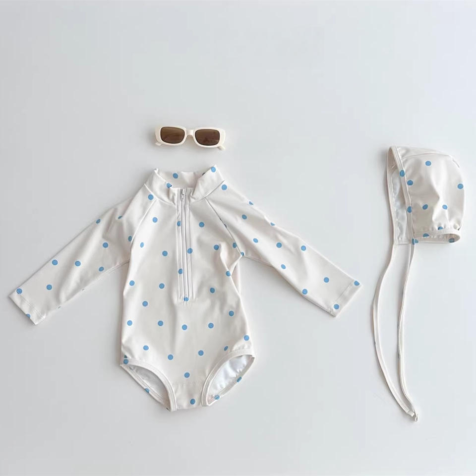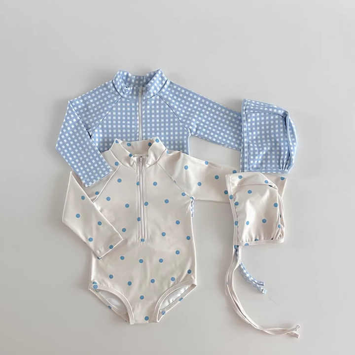 Vente en gros personnalisation pull-over coréen imprimé à pois carrés maillot de bain crème solaire pour bébé garçon et fille avec bonnet de bain été