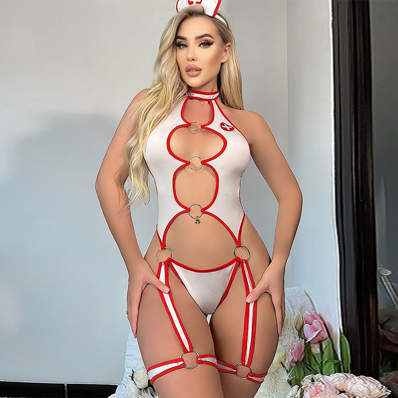 Wholesale sexy nurse uniforms cosplay costumes and nurse hats metal ring women's cutout onesie