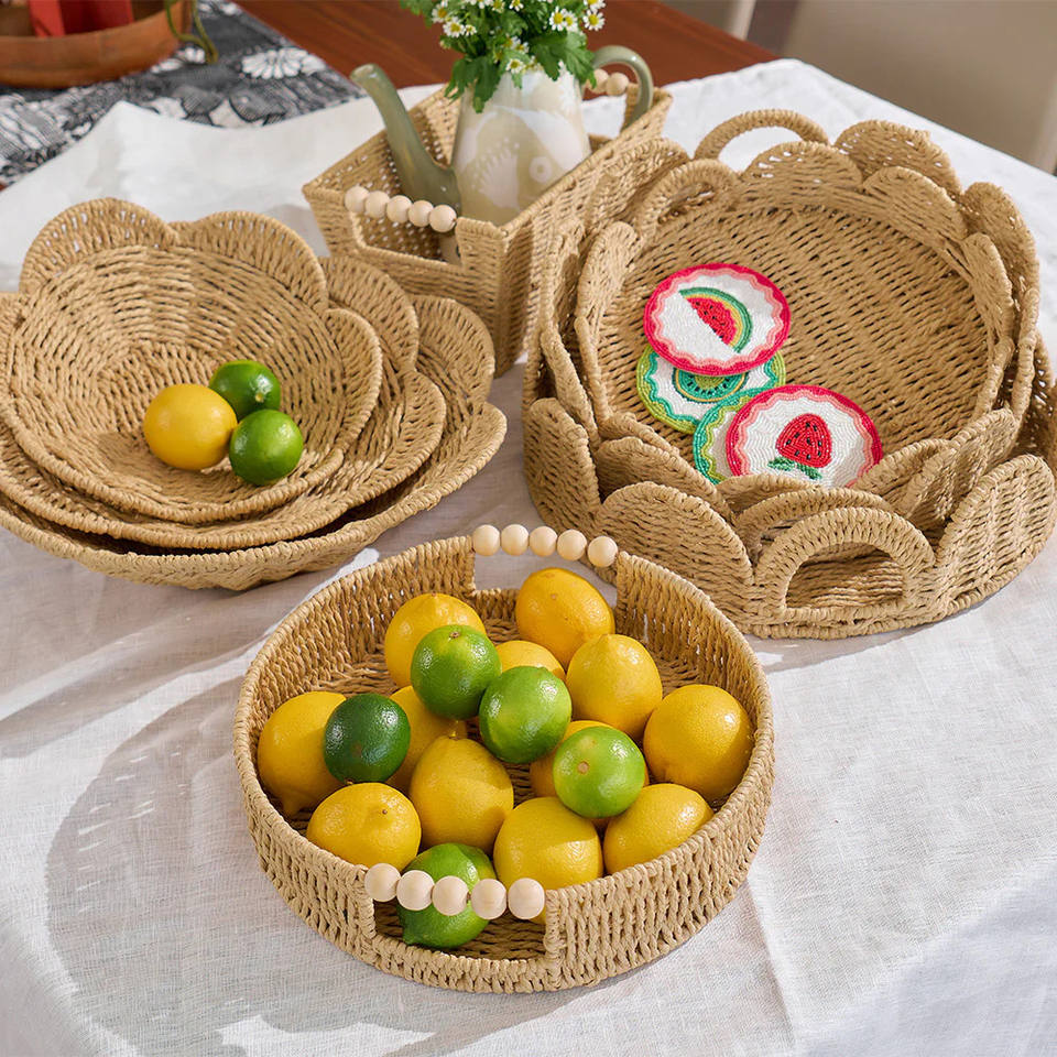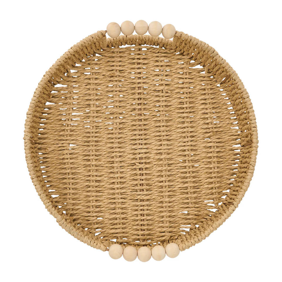 Grossiste Plateau rond en papier tissé perlé avec poignée Plateau de service décoratif en jonc de mer pour table à manger présentoir de fruits pour petit déjeuner