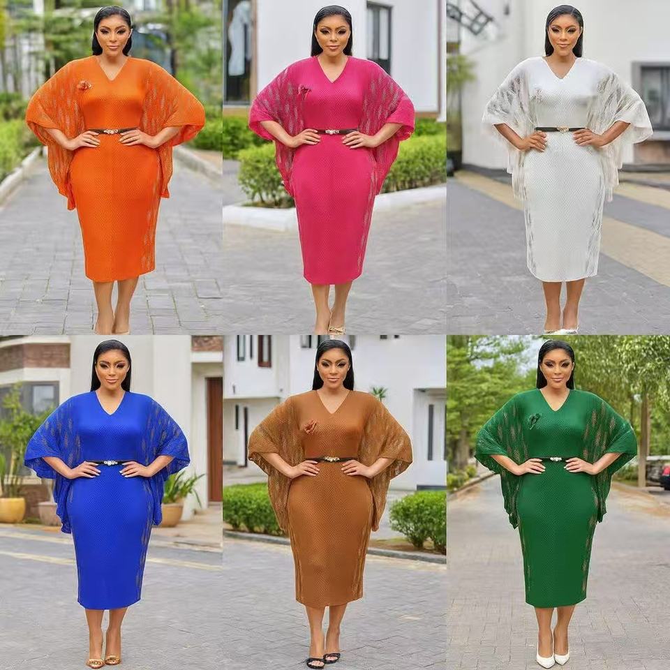Robe plissée à manches chauve-souris, couleur unie, estampage doré, avec ceinture, décontractée, élégante, grande taille, robe Miyaki pour femmes, vente en gros
