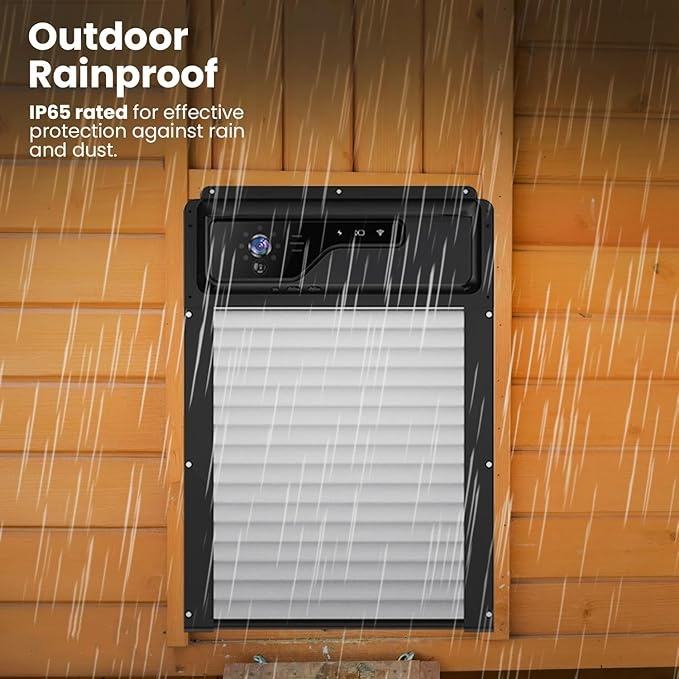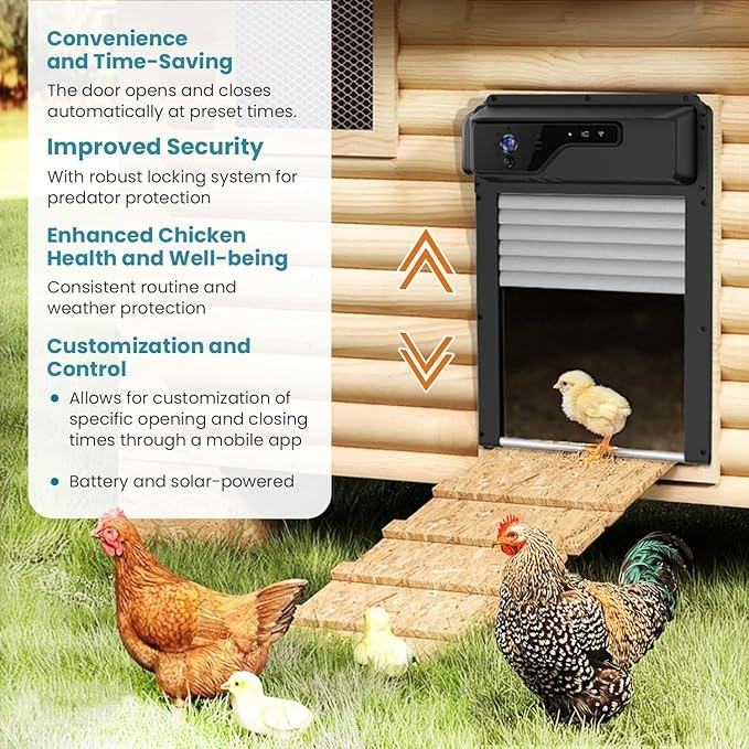Porte automatique de poulailler Wi-Fi avec caméra HD, télécommande à énergie solaire et minuterie, alarme, capteur anti-piège.