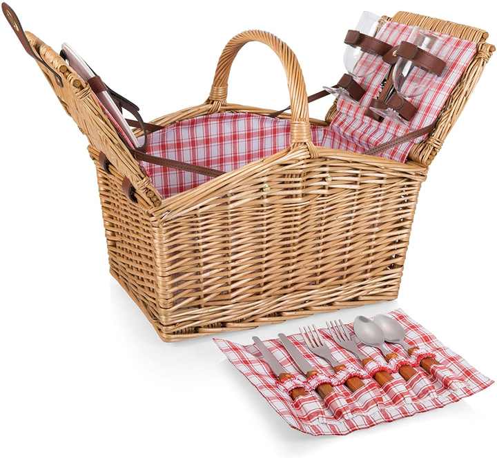 Panier de pique-nique en osier pour 2 personnes avec assiettes, verres à vin, couverts et tire-bouchon, motif écossais rouge et blanc, et carreaux rouges