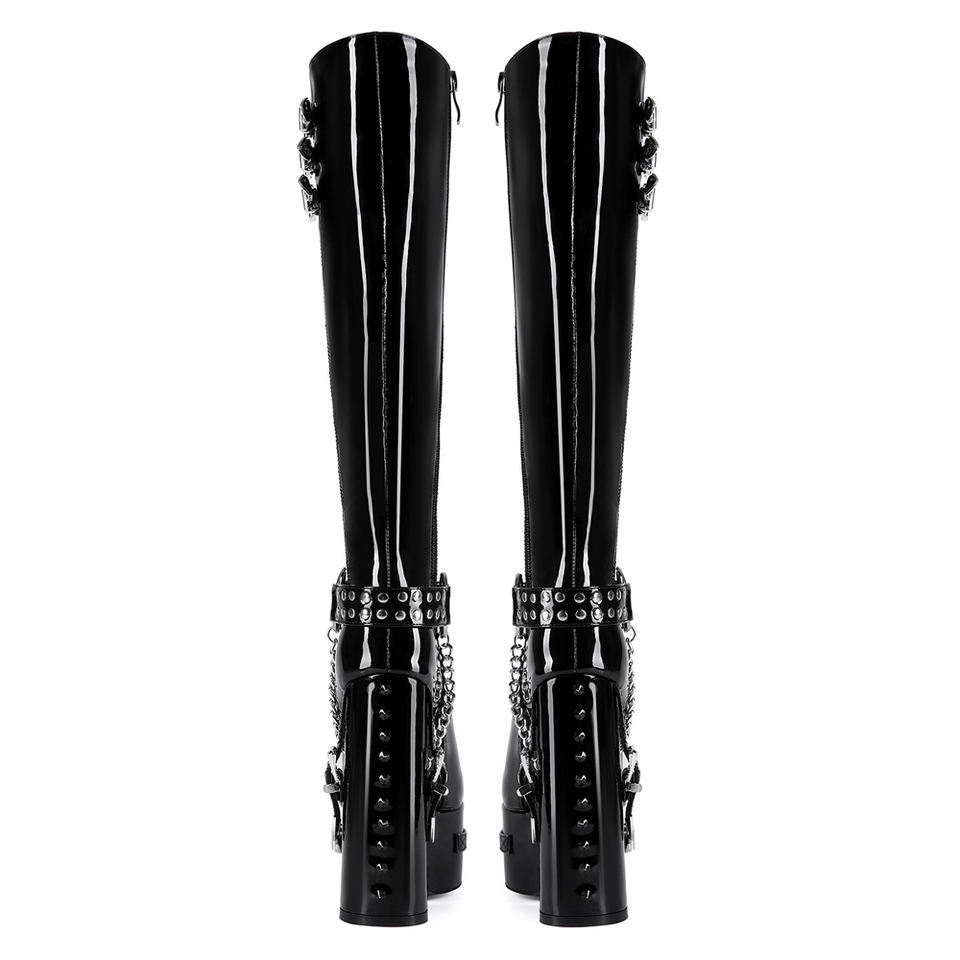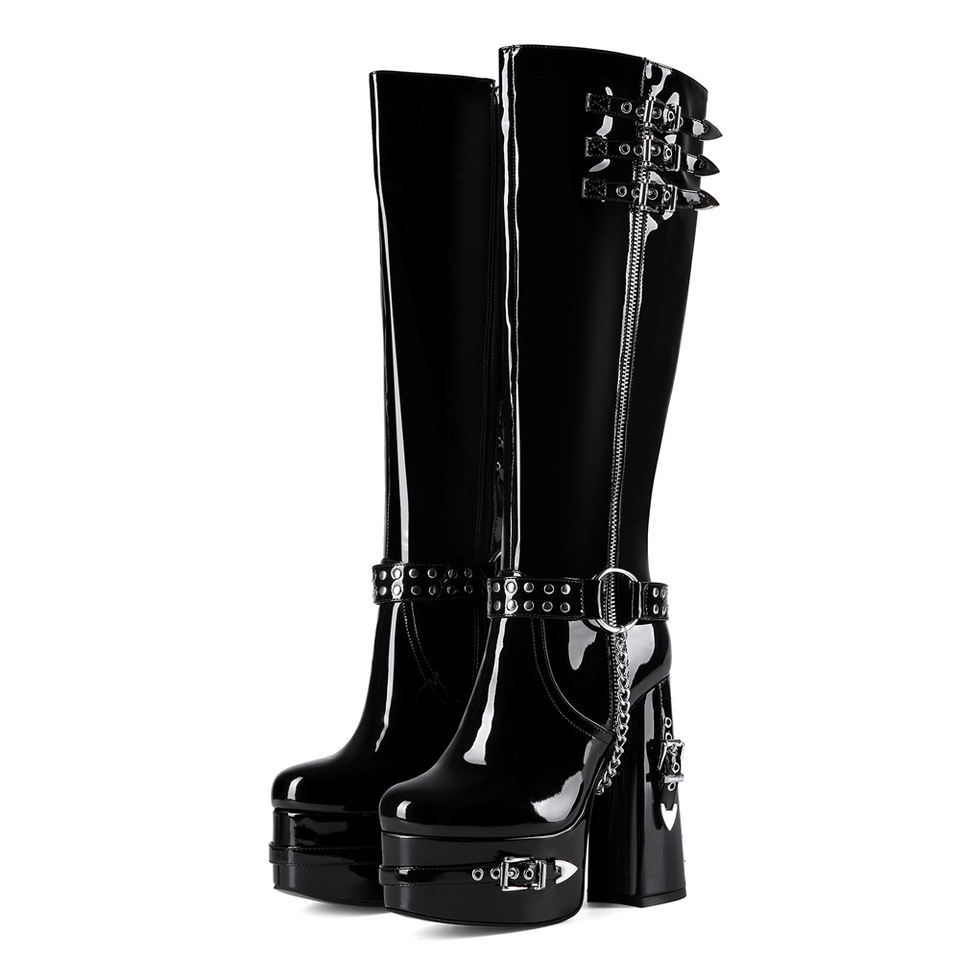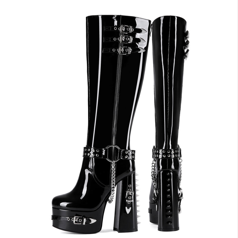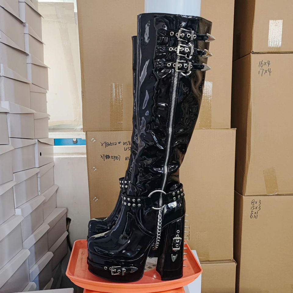 Bottes hautes pour femme à coupe large, en cuir verni brillant, avec boucles métalliques, talons épais à plateforme, rivets arrière, grande taille 47