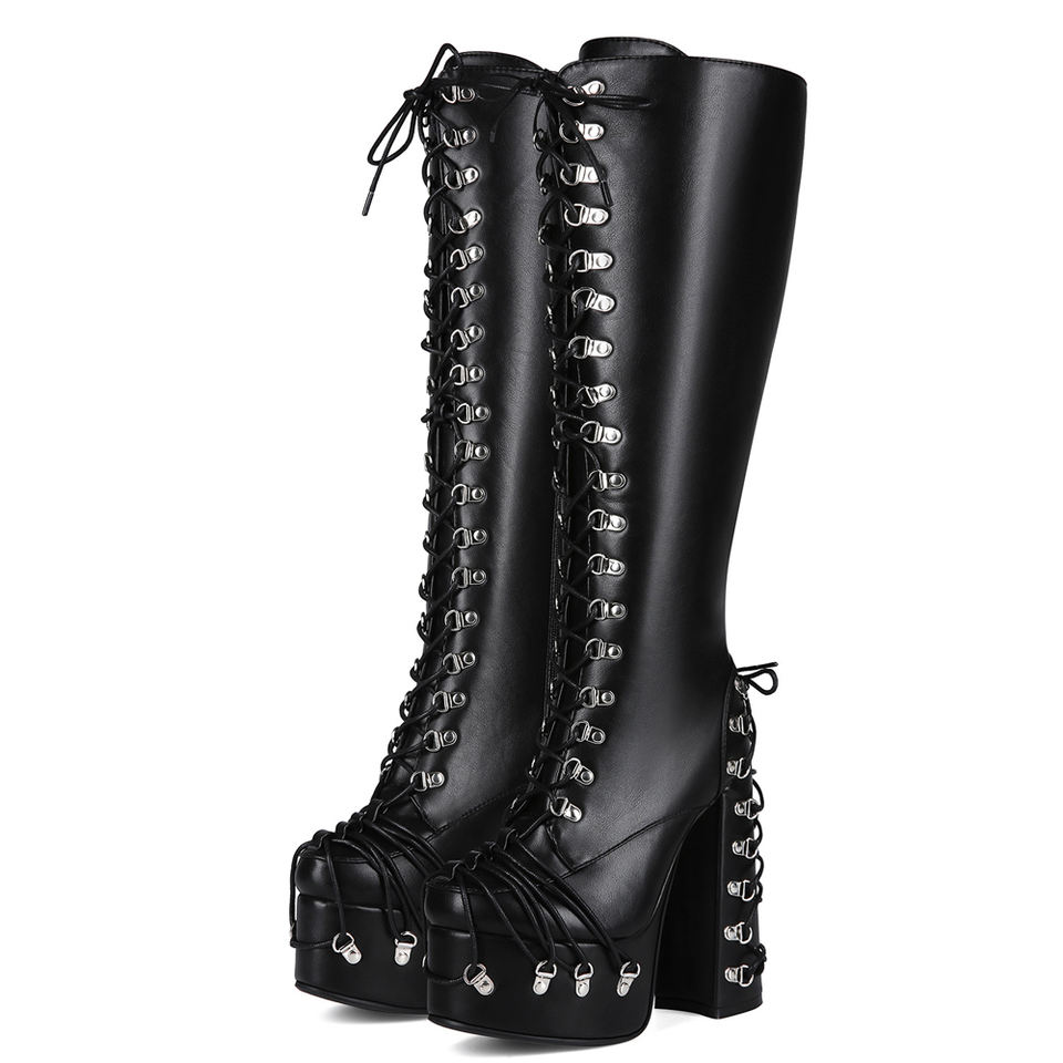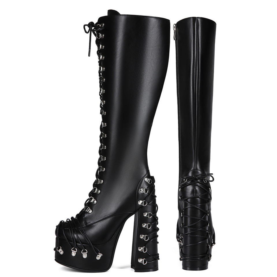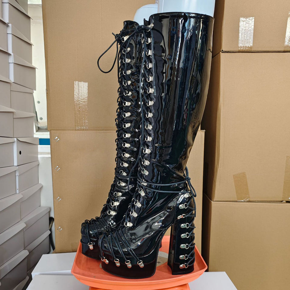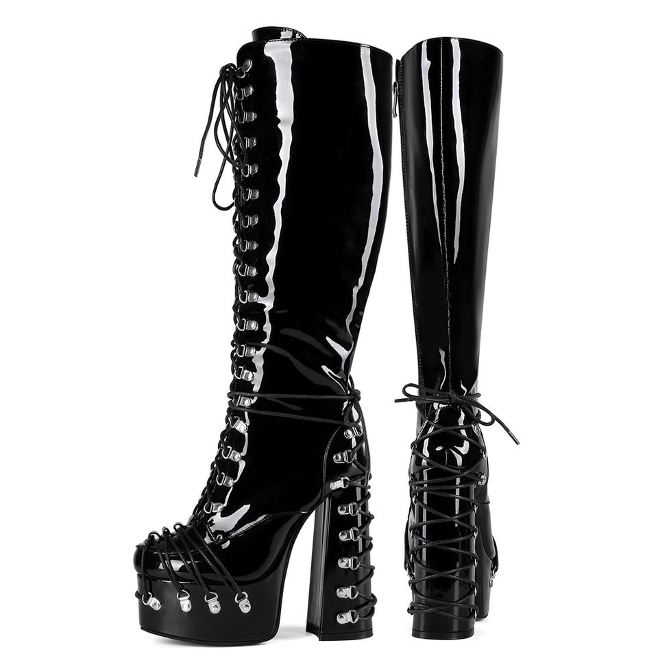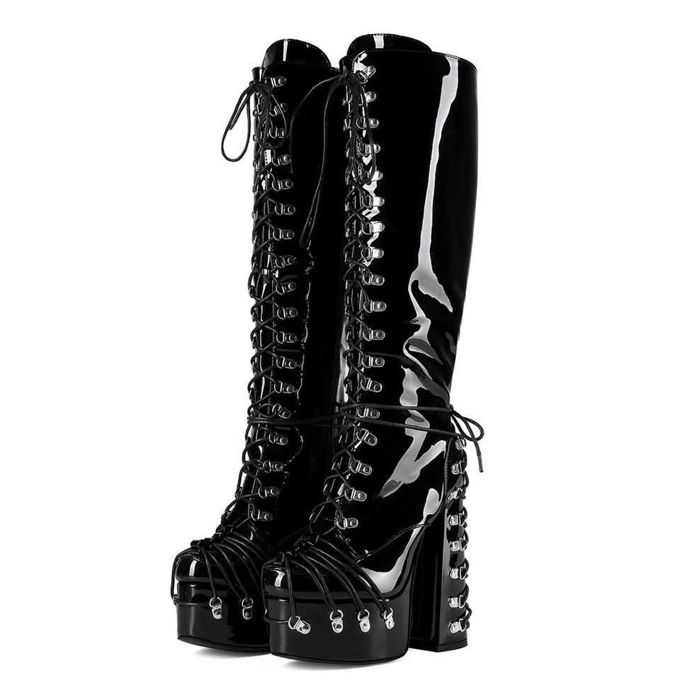 Bottes hautes à lacets en cuir verni pour femme, coupe large, avec boucles métalliques, plateforme épaisse et talons robustes, grandes tailles jusqu'au 47