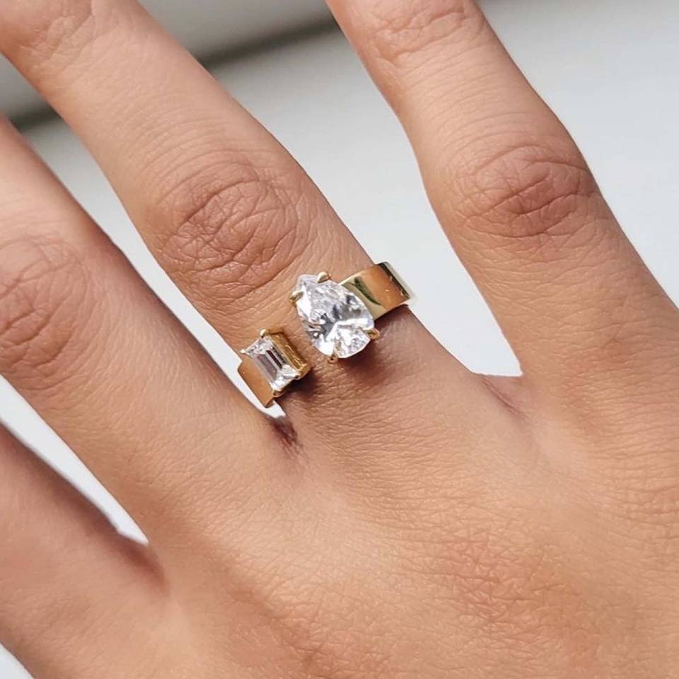 Large bande ouverte deux pierres Moissanite bague de fiançailles 2.20 CTW poire Moissanite bague Baguette mariage Toi Moi bride bague en diamant