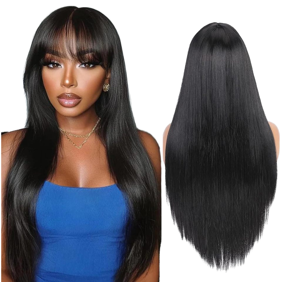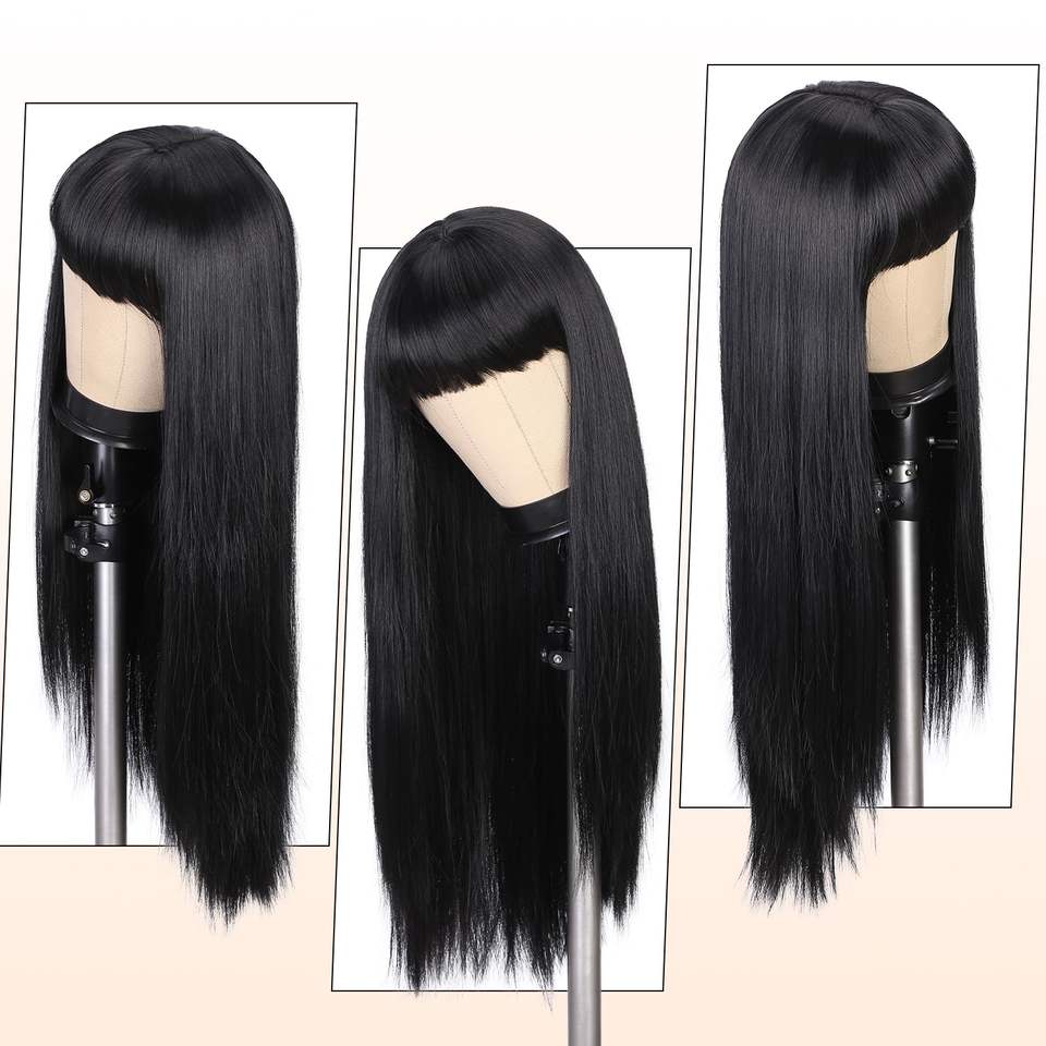 Perruque longue noire en dentelle frontale Remy avec frange, cheveux raides résistants à la chaleur, cheveux naturels, perruque complète noire pour femmes, cosplay quotidien