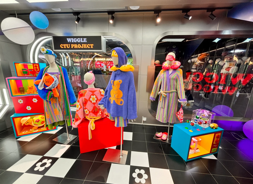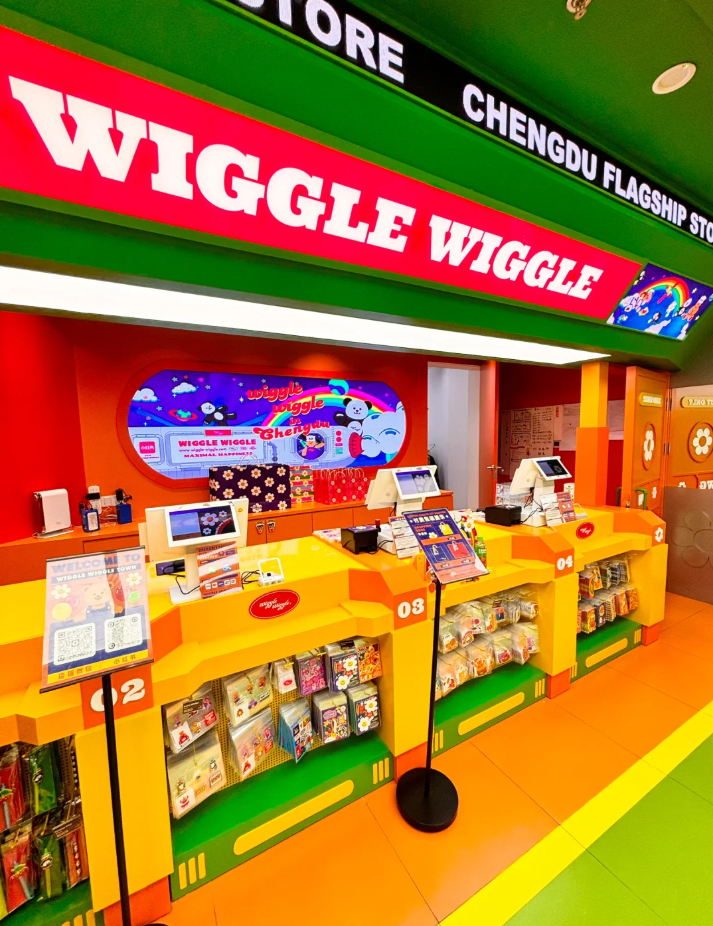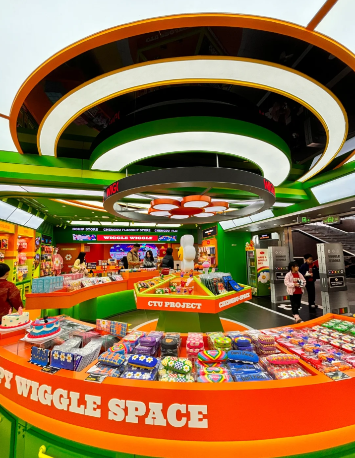 Vitrine colorée style Wiggle pour collection de jouets tendance, figurines de culture pop, conception de magasin de détail clé en main