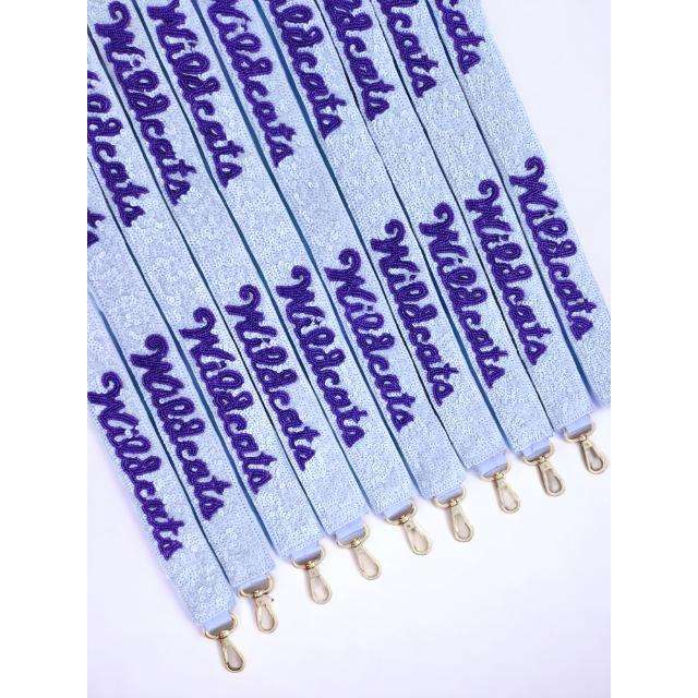 Broderie universitaire légère rectangulaire en coton et polyester, à thème Wildcats, avec bretelles perlées violettes et blanches