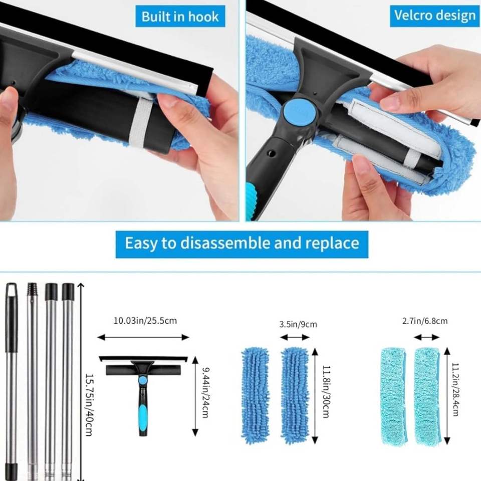 Équipement de nettoyage de raclette de vitres Kit de nettoyage de vitres 2 en 1 Outil de nettoyage de vitres extensible avec chiffon en microfibre de rechange
