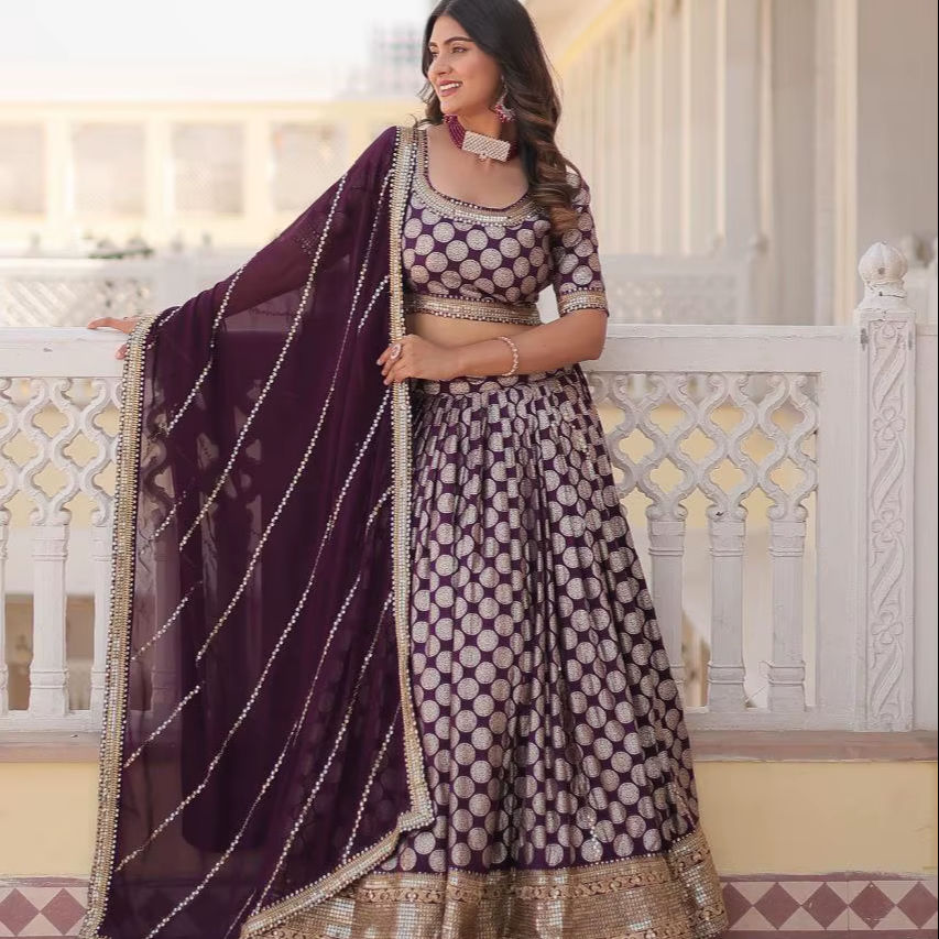 Jacquard en viscose pure couleur vin avec paillettes brodées travail Lehenga Choli & Dupatta ensemble pour mariages, fêtes, festivals