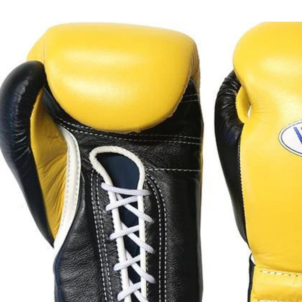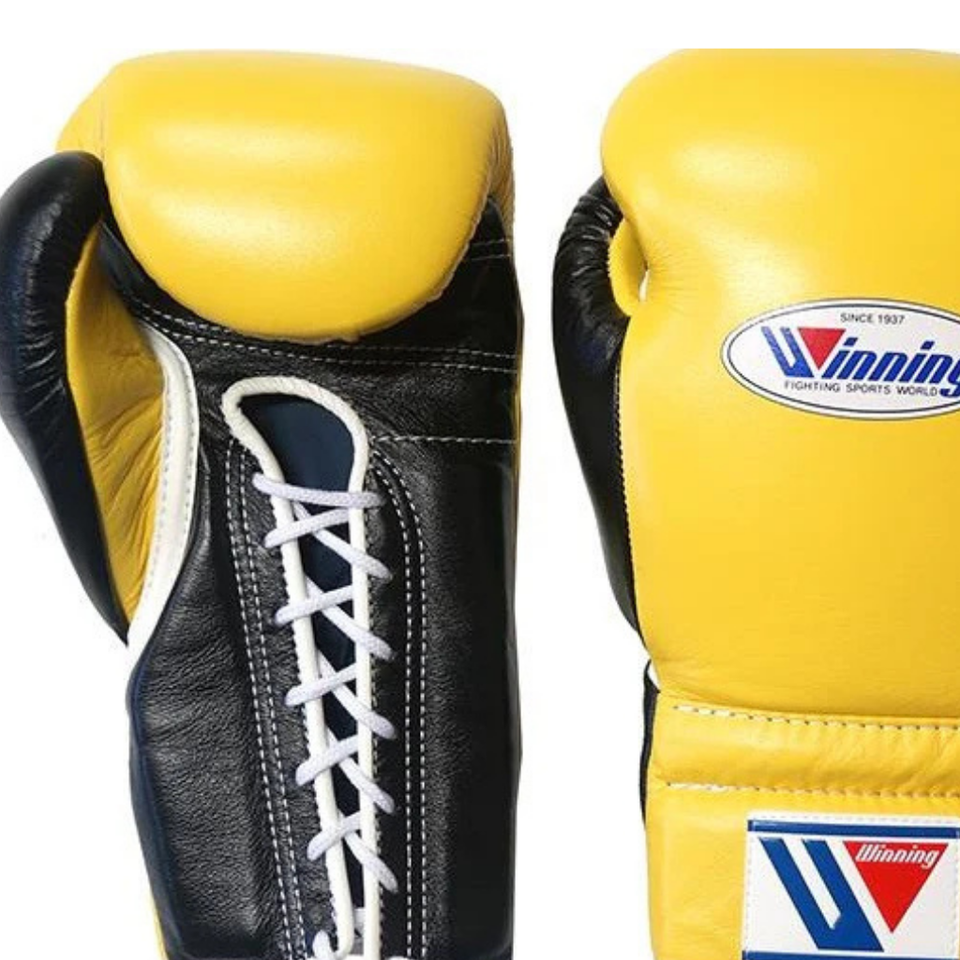 Gants de boxe à lacets Winning, jaune et noir, cuir véritable de qualité supérieure, gants d'entraînement et de combat professionnels, fermeture à lacets, 8oz, 10oz, 12oz