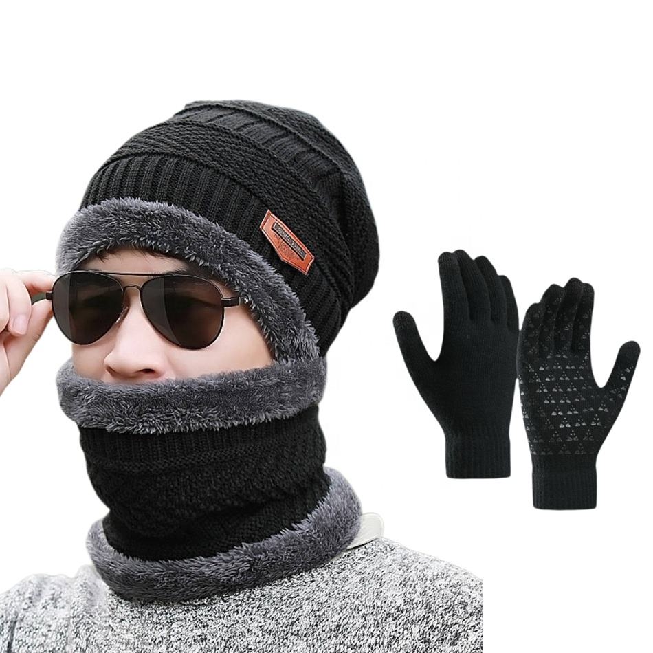 Winter Beanie Hat Scarf Touchscreen Gloves Set for Men Women Warm Knit Beanie Fleece Lined Neck Warmer Three Piece Set