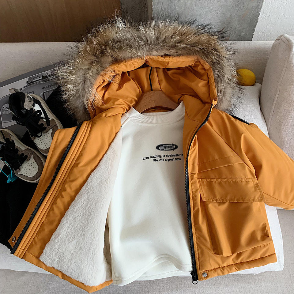 Parka d'hiver pour enfants de style coréen avec col en fourrure véritable, doublure en polaire, veste en coton épaisse, garçons et filles, tendance et chaude