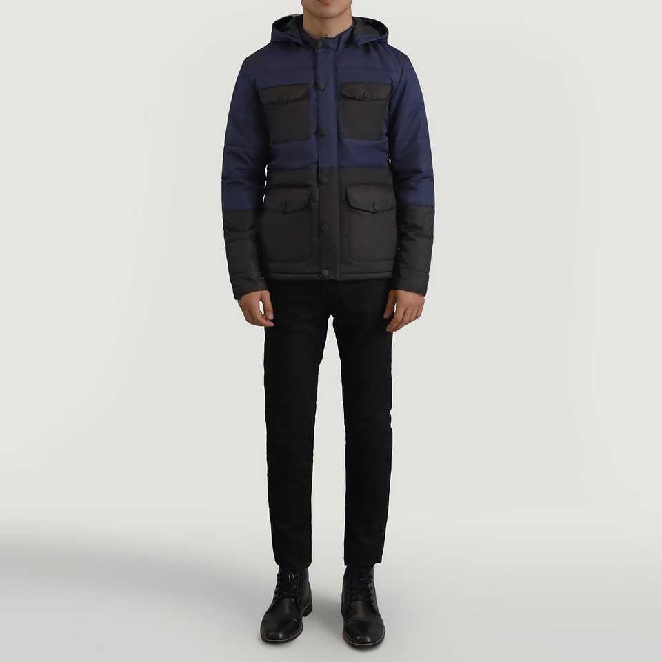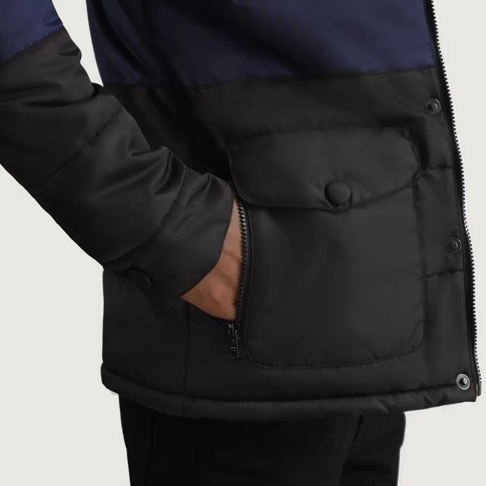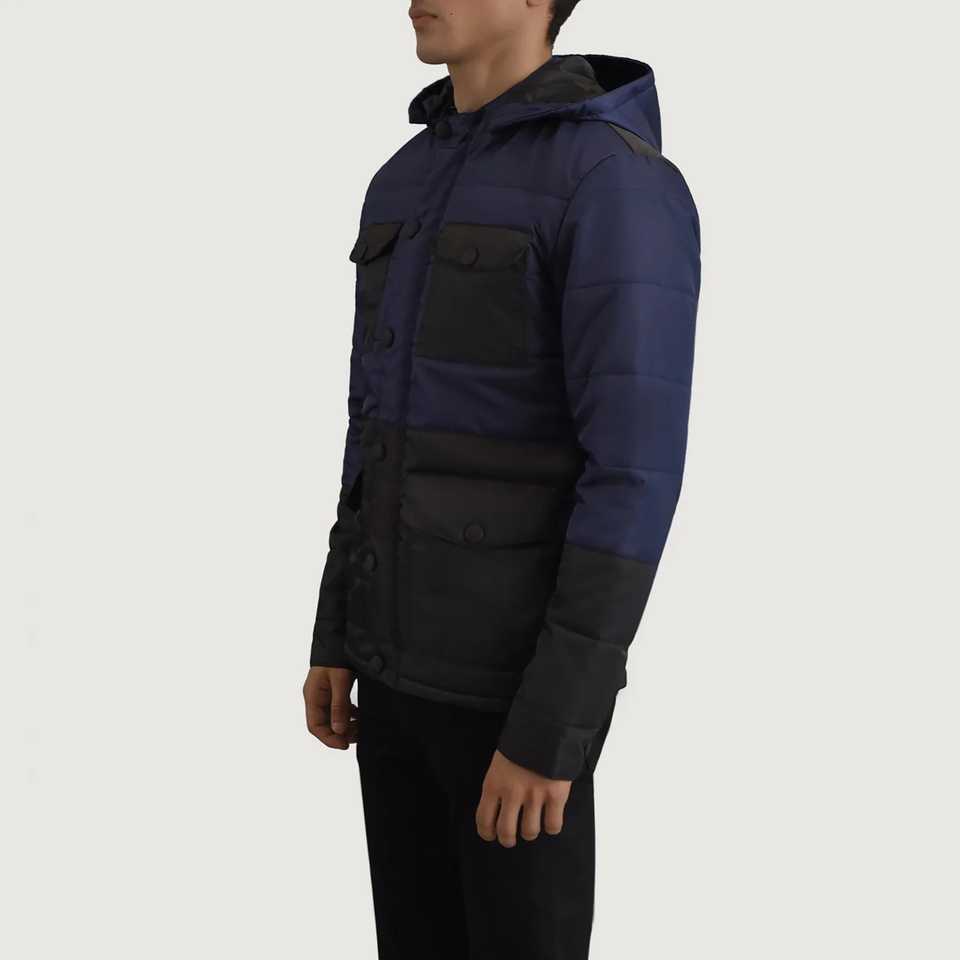 Hiver Logo personnalisé Wayne Noir & Bleu Bouton à capuche avec fermeture éclair Veste pour homme Veste d'hiver d'extérieur Dernier design